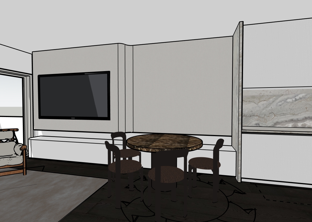 austral dream dolomite on benchtop brown dark emperor marble dining table rey chair umber brown brown japanese black timber floor polytec bianco woodmatt cabinets black mirroed vzug ovens on mohogany wallnut timber cabinetry tower lo co almond knob oil rubbed bronze warm tone rub jangada armchair in off white leather tv curved wall to kictchen in limewash warm tone on a warm winter morning light in sydney an apartment facing north with sheer curtains