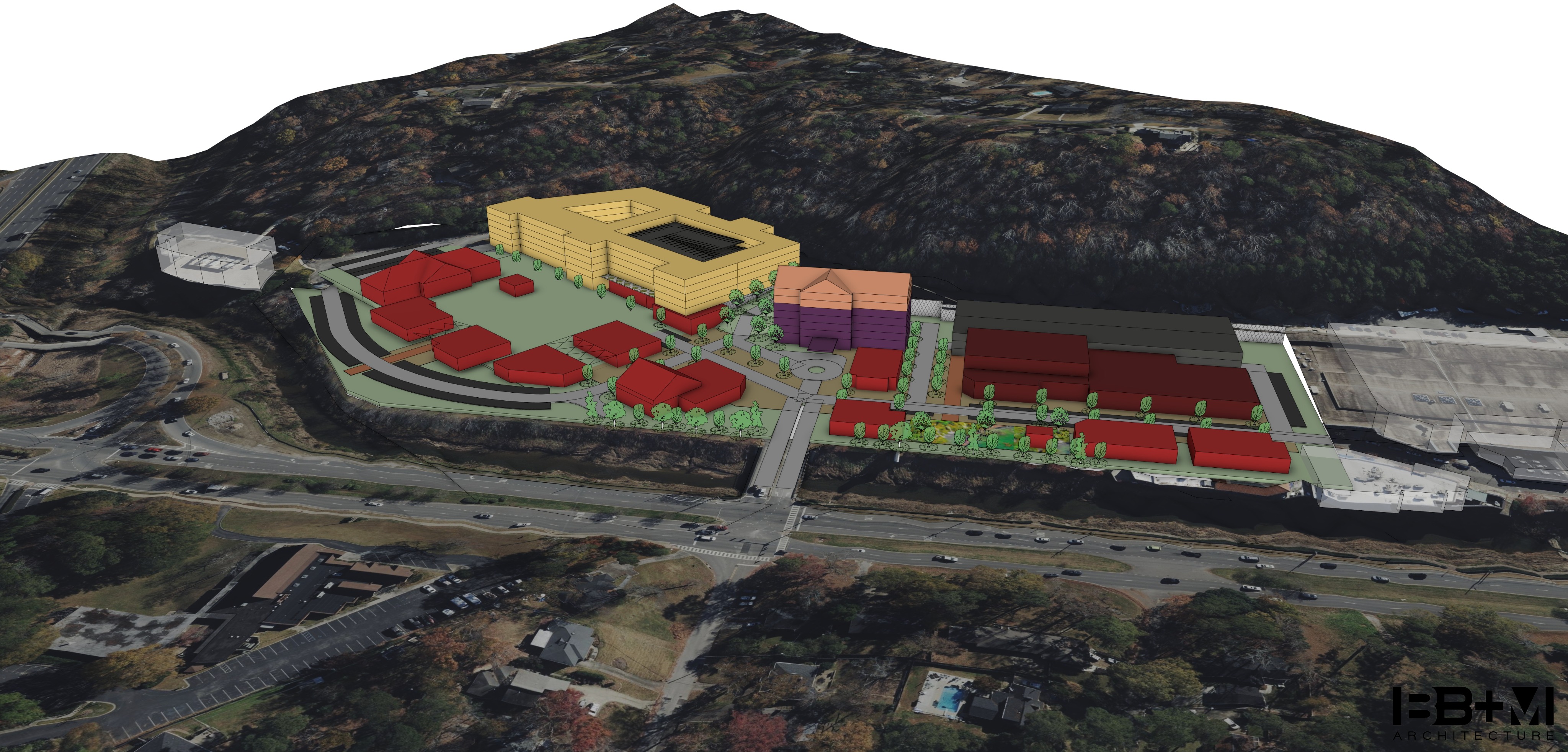 contemporary retail development with hotel purple block and multifamily yellow block retail buildings red blocks with lots of activity with cars and people long shadows watercolor style image