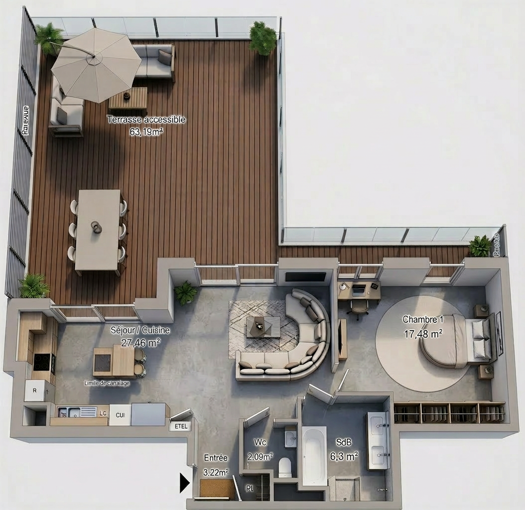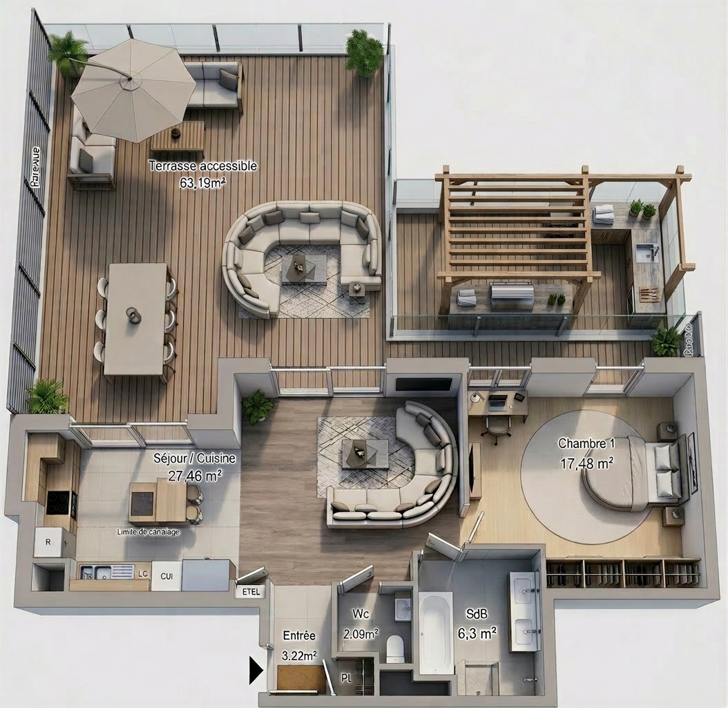 convert this floor plan into a realistic isometric 3d view of a full house show the space from an elevated angle with furniture walls and details visible keep everything as it is in the picture its already perfect i would like to add a pergola on the right side of the terasse under the pergola there is a barbecue and an outdoor kitchen please don t modify the extreme right of the picture the little outdoor corridor use the same furniture as shows on the plan do not change the orientation of the floorplan