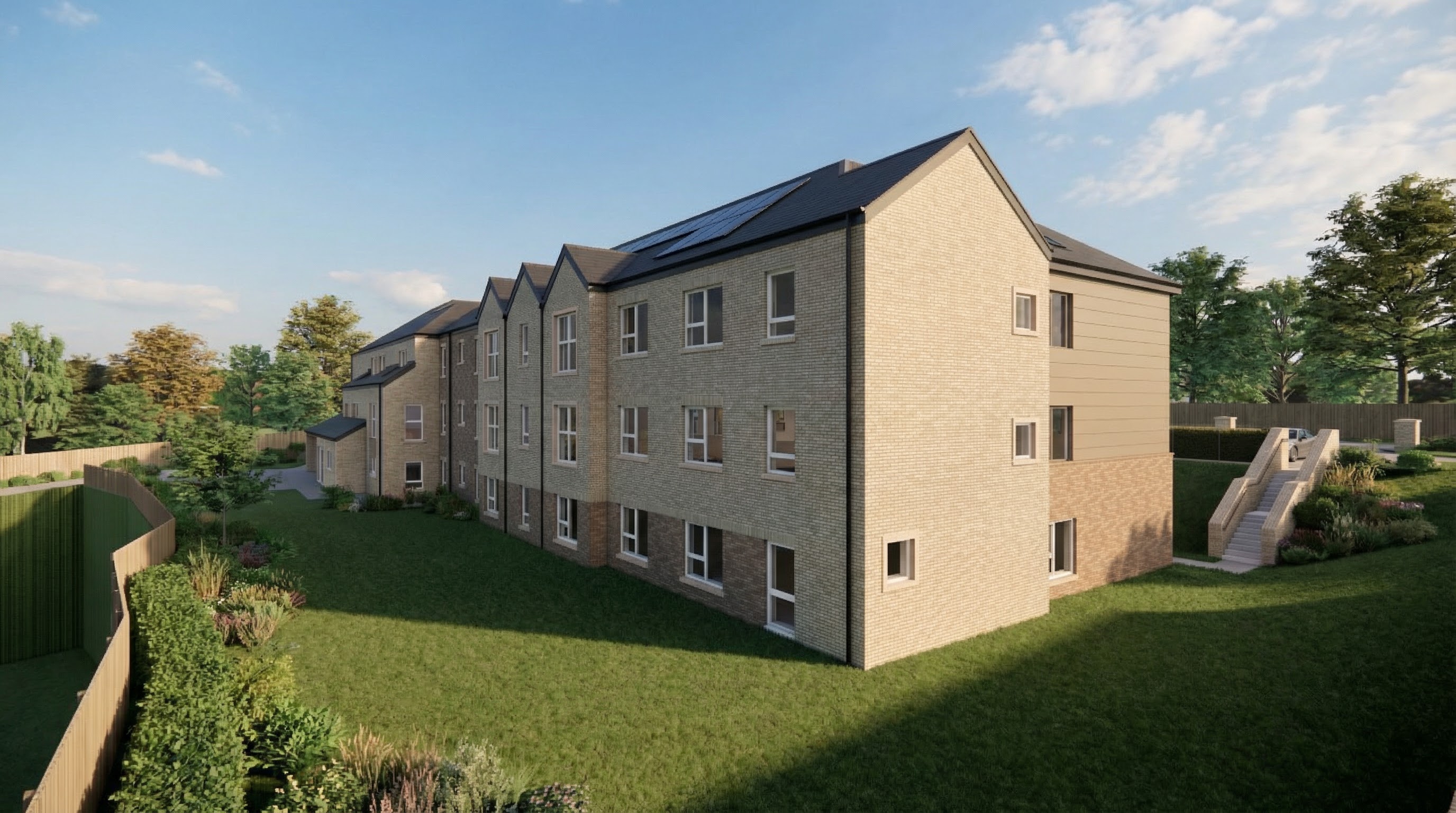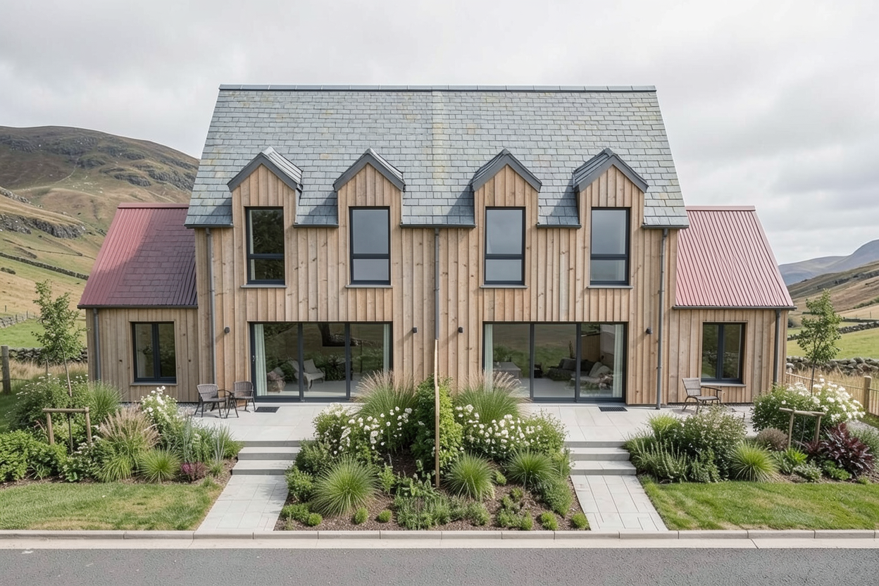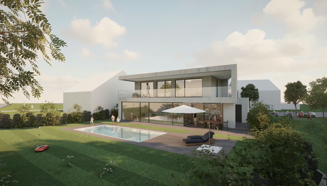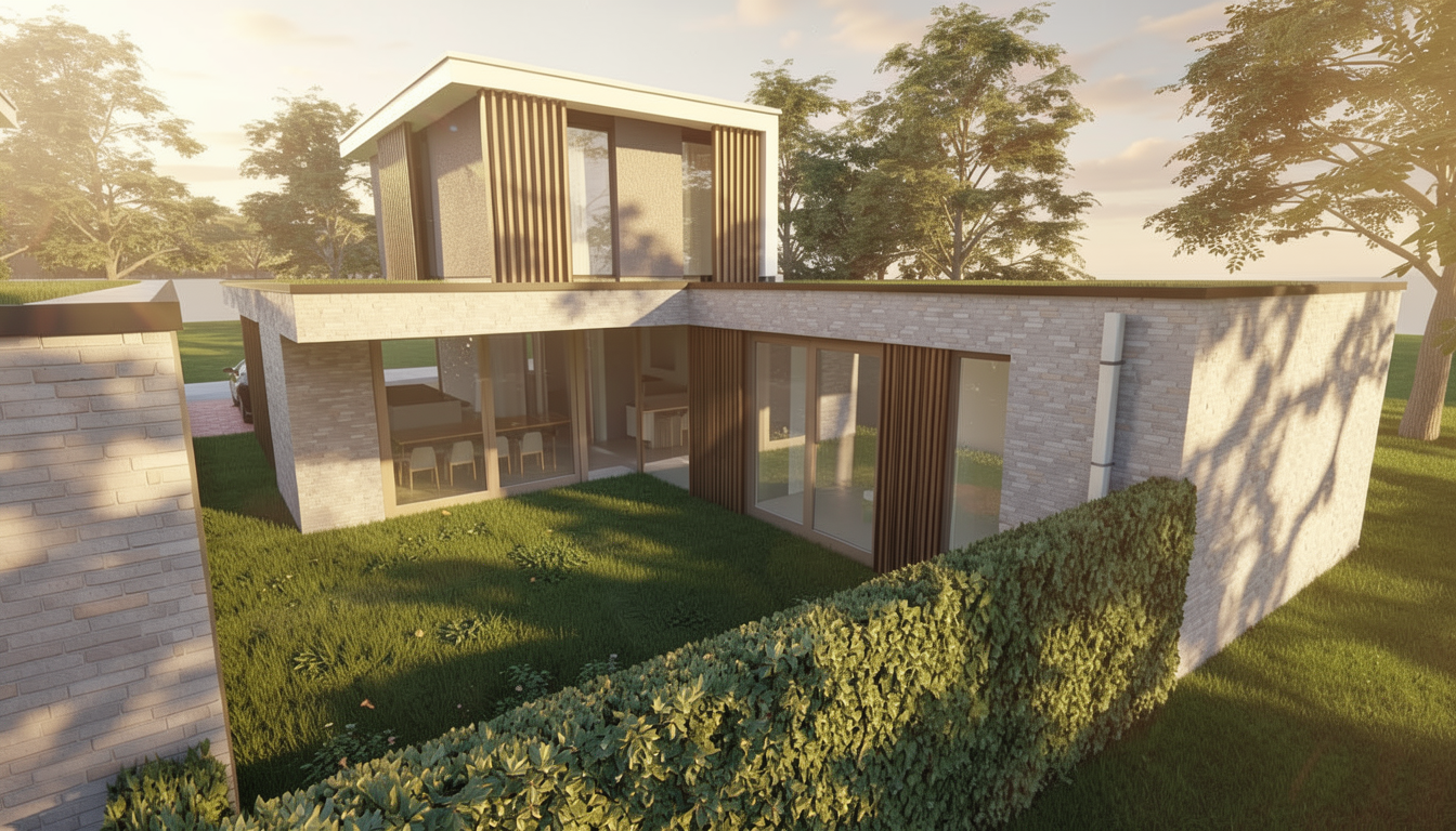 create 3d rendering of home with white siding and grey stone with black trim and black metal roof on a sunny day with lots of vegetation