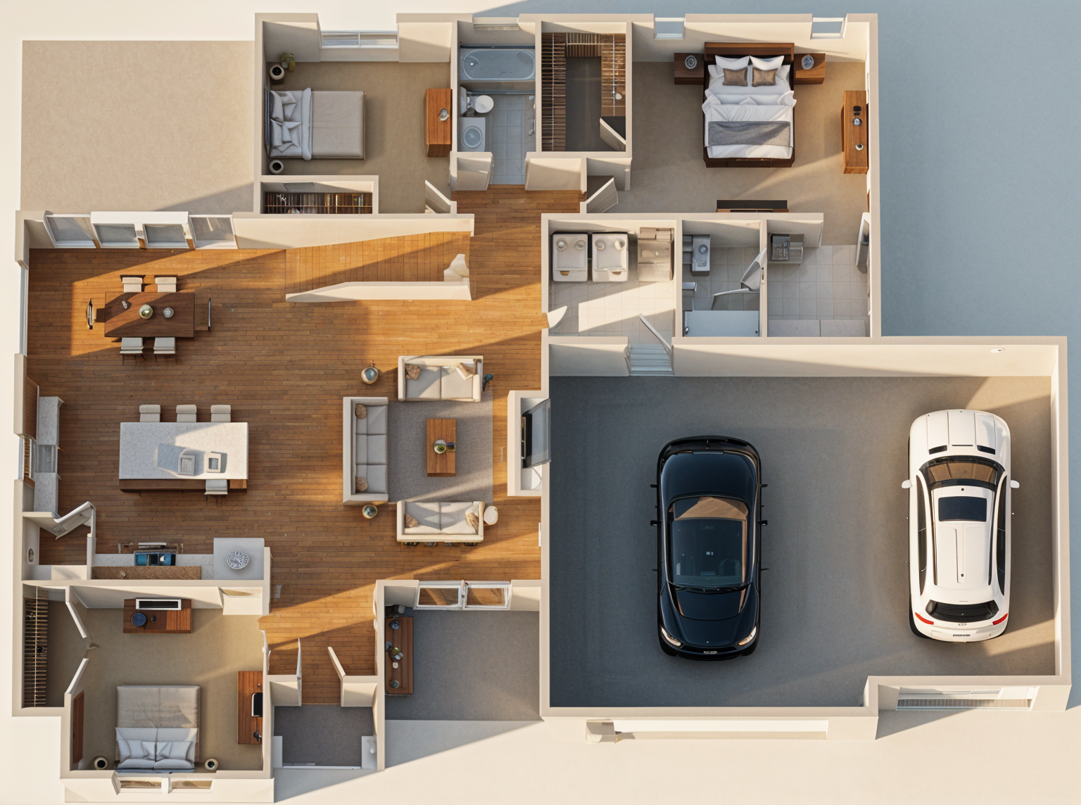 render a photorealistic 3d perspective of this outdoor living space reference the current material style just enhance them for photorealism keep model geometry the same do not change the view only enhance the current materials detailed textures in stone and grass and a vibrant clear sky with light atmospheric depth render in hyper realistic architectural visualization quality 8k resolution shot on nikon d850 lush green lawn architectural photography 8k ar 16 9 style raw