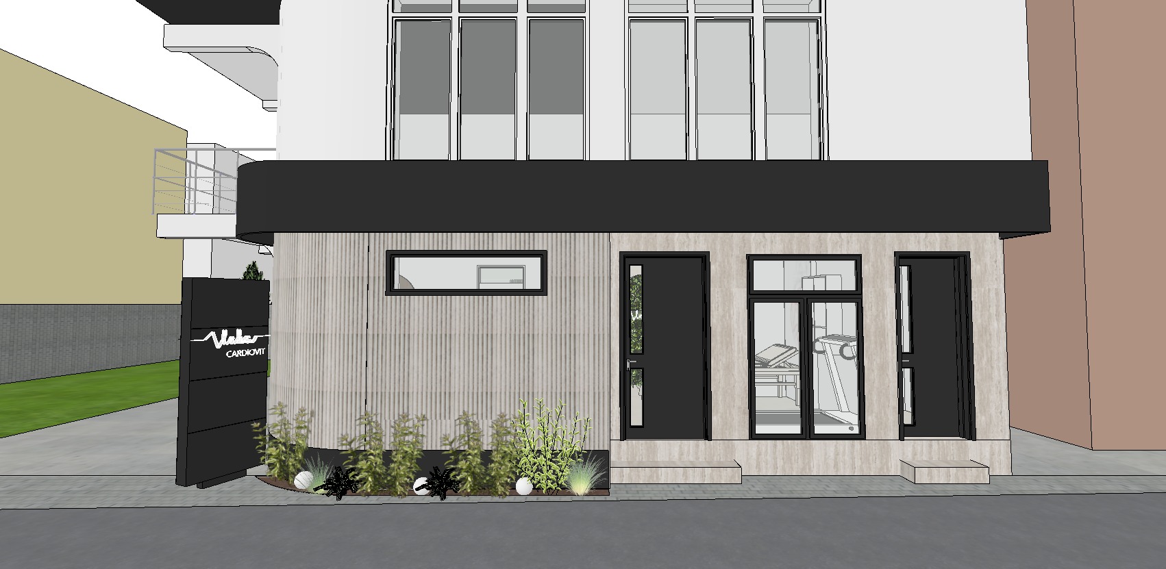 this is a residential building which on the ground floor is used as a cardiology clinic and therefore the facade should distinguish the ground floor from the floors the upper floor is only painted white and white curtains are placed in the interior while on the ground floor the windows should be blurred so that the interior is not visible the greenery should be real and the white spheres are lights while on the left side the structure from the ground is with anthracite alubond which logo should be with led light so that the writing is clearly visible the ground floor windows should be black so that they are not visible from the outside while on the upper floor place curtains in the interior do not change anything except the ones you mentioned the render should come out as real and with high quality the render should be as real as possible and you should not change anything in the design of the facade or add anything do not put curtains in the interior on the ground floor on the left side the facade material on the arch is modern facade with vertical luted architectural concrete panels precast textured concrete subtle natural imperfections soft shadows between grooves the door on the right side should be the same as the other door on the left side of the windows