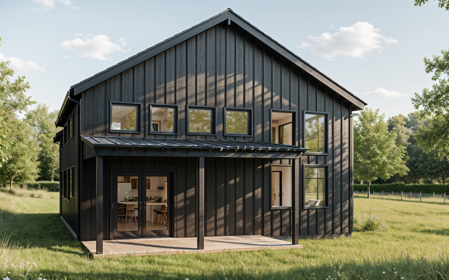 interior shot two windows with curtains and a lush backyard outside