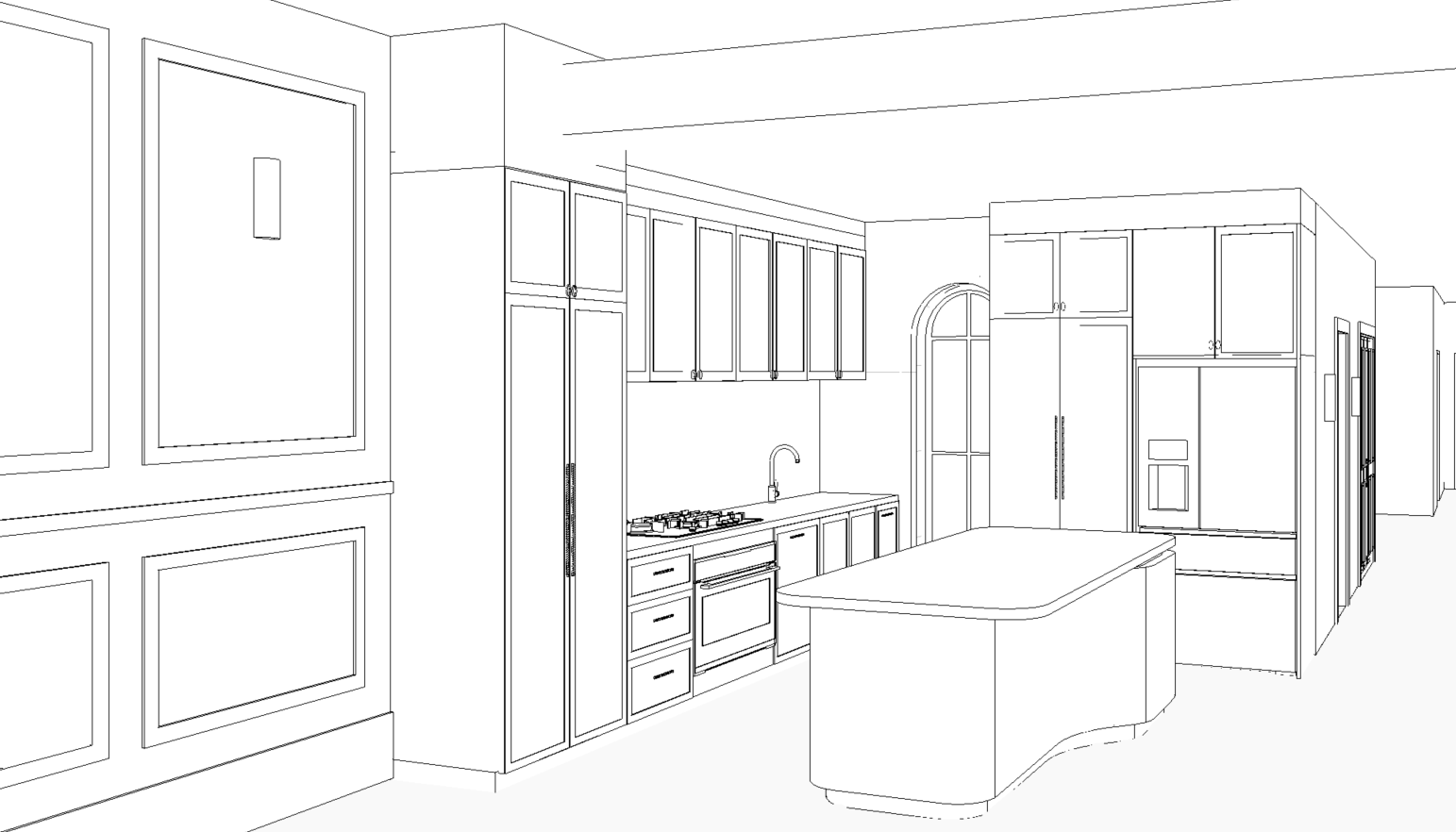 casper white quarter walls joinery wainscotting alabaster wall light green blue quartzite benchtop stainless steel fridge grey brown light chevron floor brass sink tap black steel rear arch door to courtyard