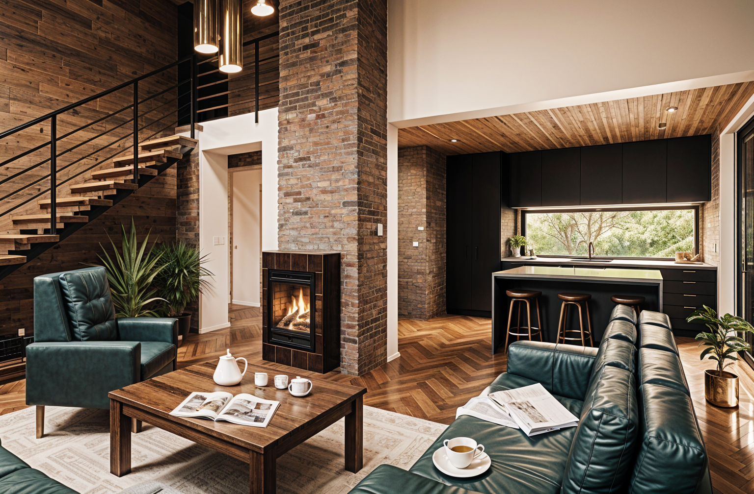 detail shot kominek kaflowy z kaflami w kolorze karminowym meble w kuchni w kolorze szarej zieleni frezowane schody stalowe loftowe pod wietlone ciana przy schodach ob o ona star ceg jak przy kominku architecture