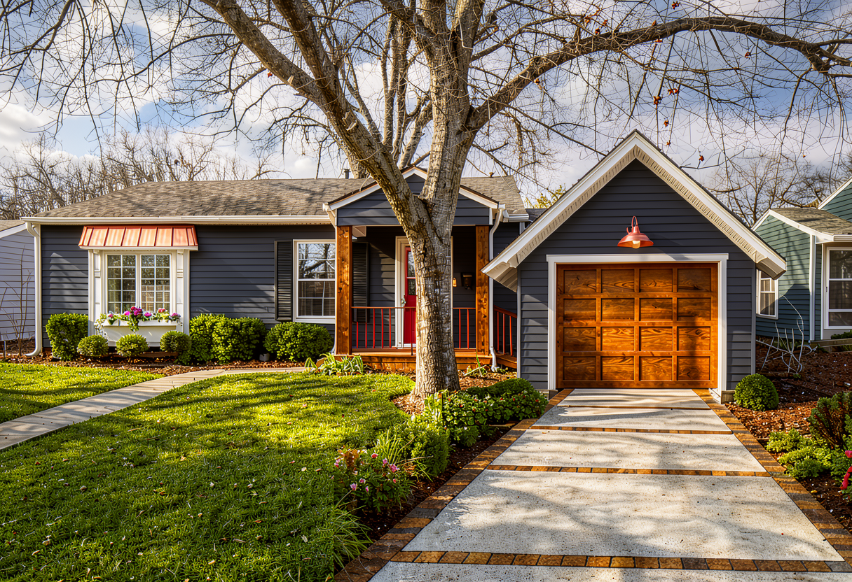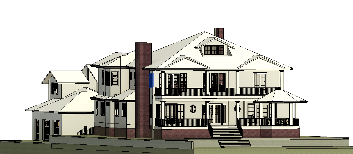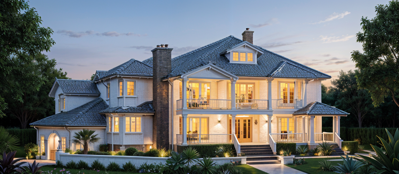 realistic image dusk sky outside turn on exterior and interior lights lush landscaping exterior walls whitewashed brick white painted panel columns white railings white frames at windows gray shake roof warmer lights more lush landscaping slightly lighter sky make border wall brick veneer to match the chimney