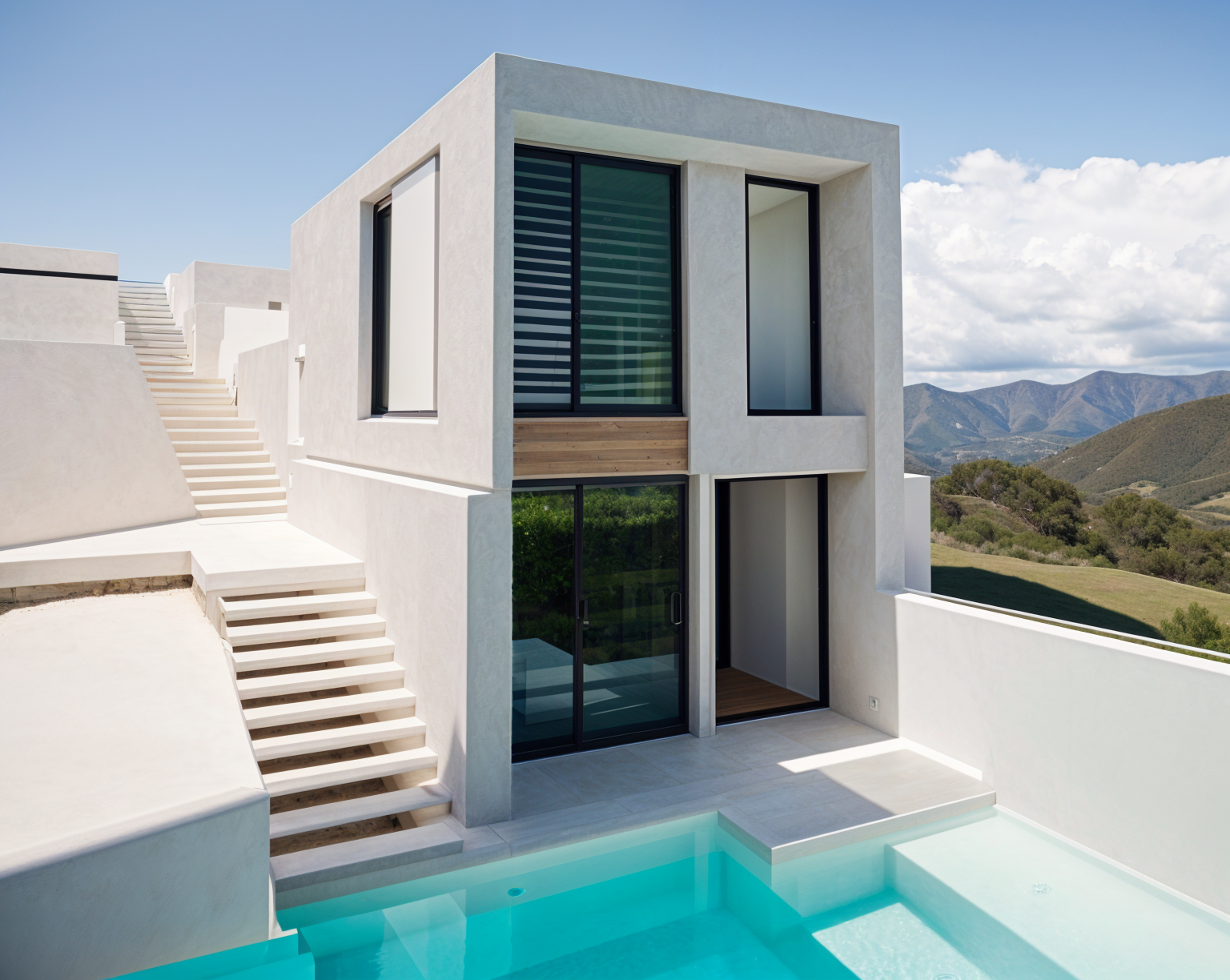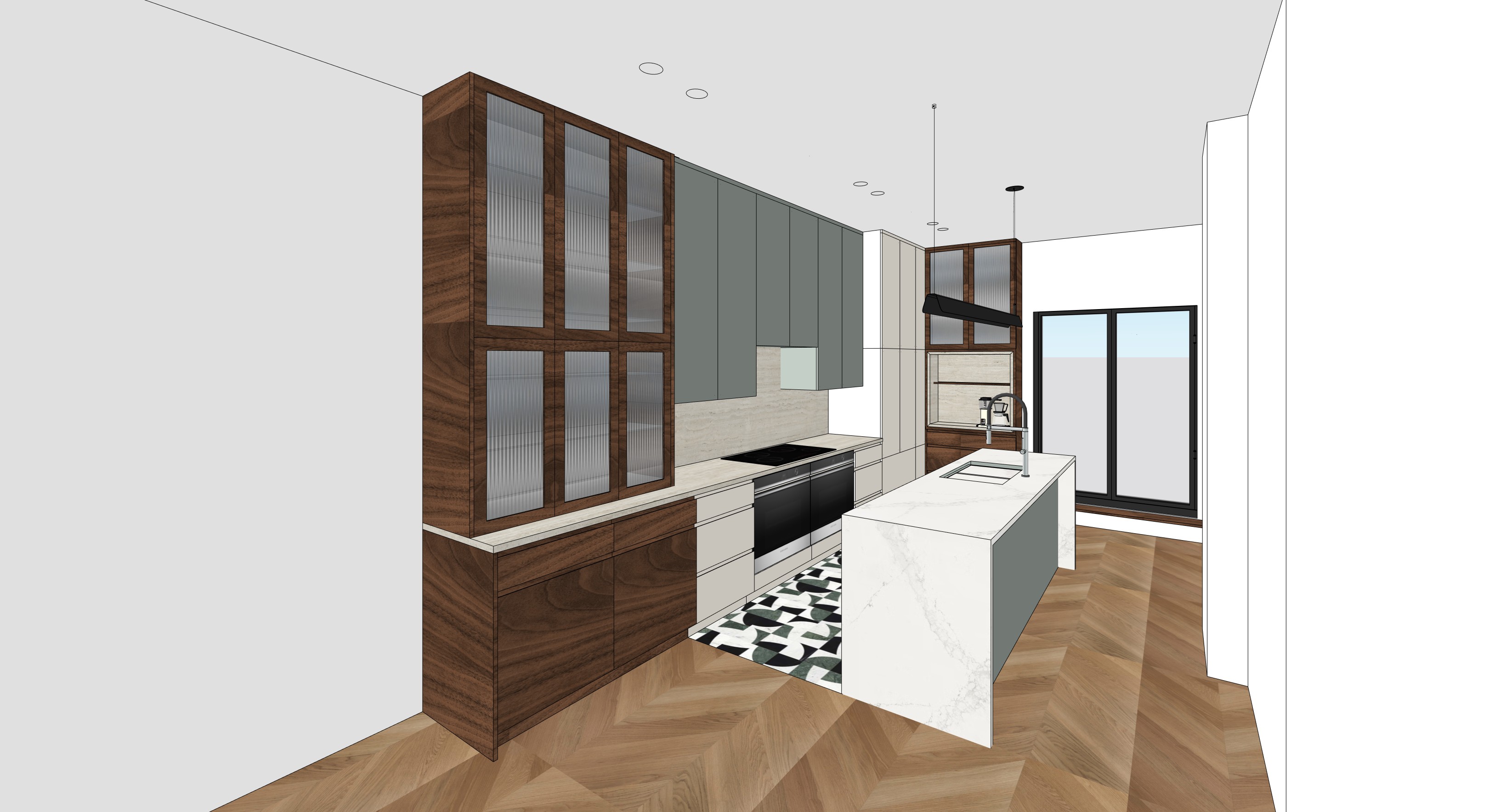 interior shot render this kitchen in hyper realistic quality apply walnut veneer cabinetry with visible grain and matte finish fluted glass inserts in the tall cabinets lower cabinetry in soft beige lacquer island painted muted sage green with a white marble waterfall countertop subtle grey veining main countertop and backsplash in light travertine stone honed finish flooring in natural oak herringbone matte finish kitchen tile inset in front of the stove with bold black green and white geometric pattern polished finish matte black linear pendant above the island brushed nickel faucet with modern pull down spout and slim satin nickel cabinet handles realistic daylight coming through large black aluminum frame windows soft shadows photorealistic materials accurate reflections natural depth of field