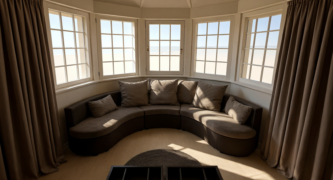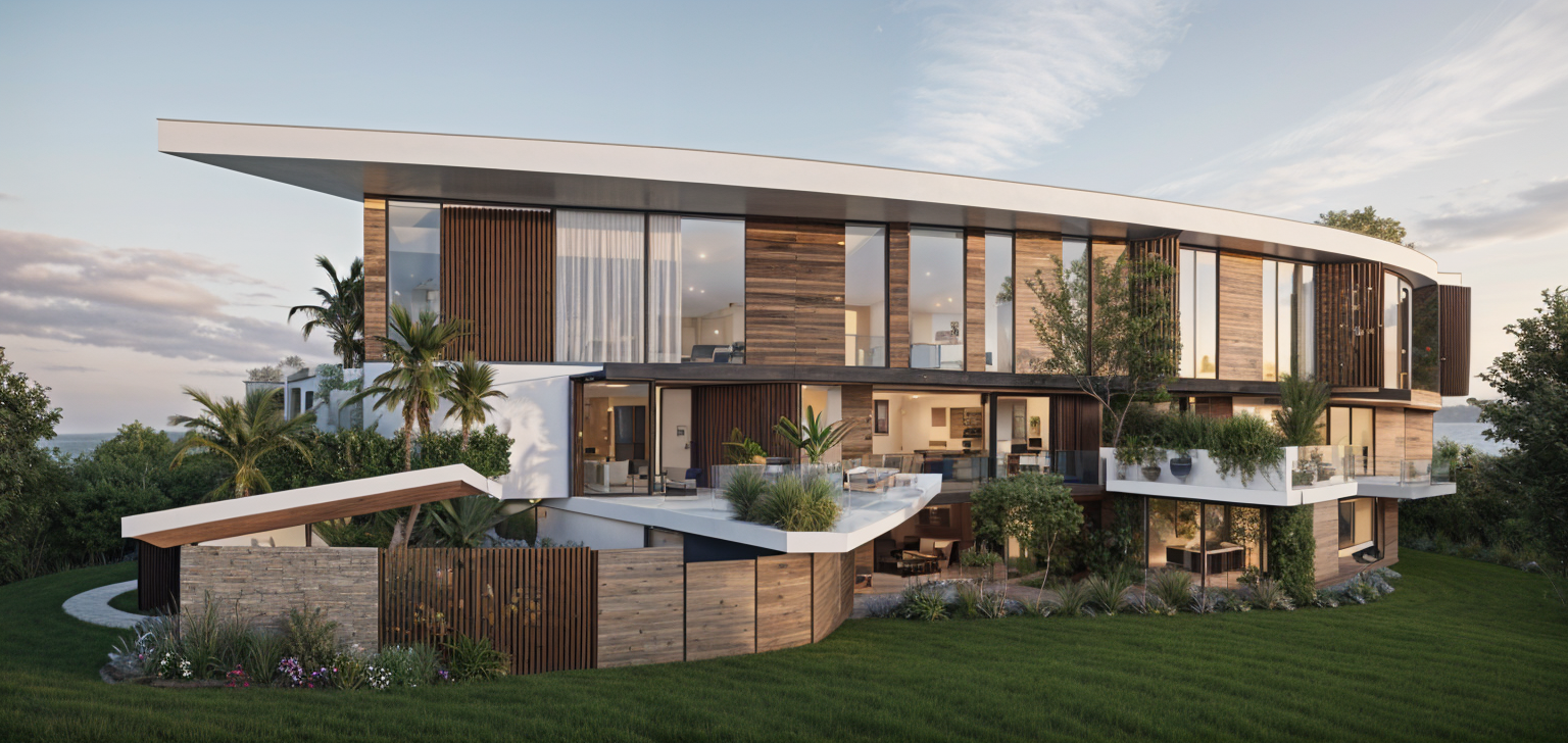 modernist perspective shot use nature coziness and greenery set in the evening with soft gentle sunlight put a stair in the middle circular architecture