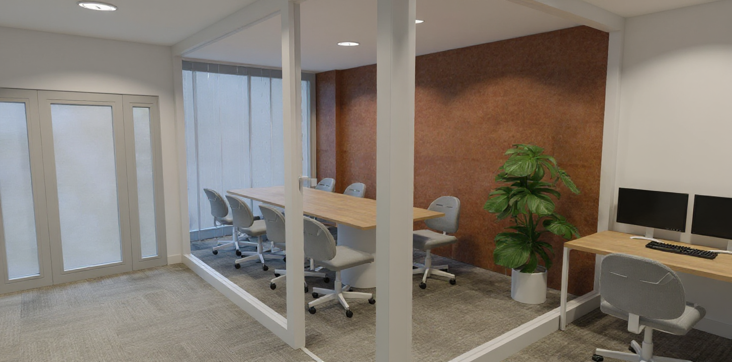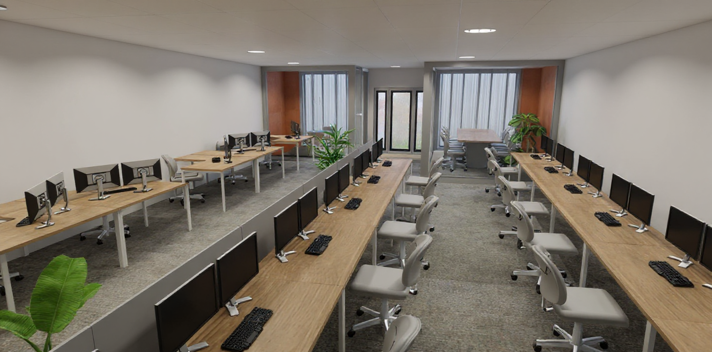 render a modern corporate office space with a sleek minimalistic design use crisp white for the walls to create a calm neutral atmosphere the desks should be a warm natural wood tone white metal legs complemented by sleek black computer monitors and keyboards add ergonomic chairs in a soft gray white color ensuring comfort and style incorporate large potted plants with vibrant green leaves to add a touch of nature install soft diffused lighting to create a warm welcoming ambiance use light grey for the partitions offering privacy while maintaining an open and airy feel kitchen has a soft blue colour in a matte finish with gold handles terracotta stools line the island bench overall aim for a balance of professionalism and relaxation with a focus on clean lines and functionality