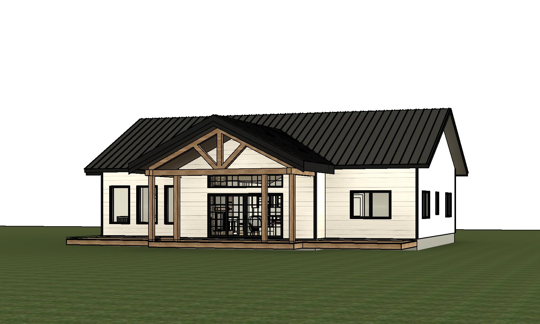 a country style rancher home with a combination of white horizontal lap siding and white board batten black fascia soffit black corner trim bronze tinted windows black standing seam metal roofing exposed natural timber posts and beams enhance materials and colors keep exact window structure arrangement deck columns beams rooflines and proportions exactly as shown in the reference image soft interior lighting inside the home creates warmth add some common landscaping features around the home such as flowers rocks bushes walkways surround the property with a lush dense forest of tall mixed evergreens and hardwoods place the sun behind the trees so warm golden sunlight beams through the branches casting soft rays and subtle dappled highlights across the patio siding and grass create ultra realistic lighting crisp shadows detailed textures in the wood and glass reflections and a vibrant clear sky with light atmospheric depth render in hyper realistic architectural visualization quality 8k resolution
