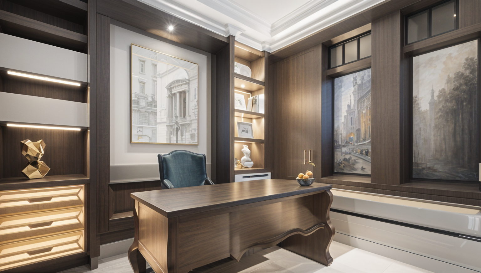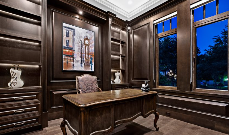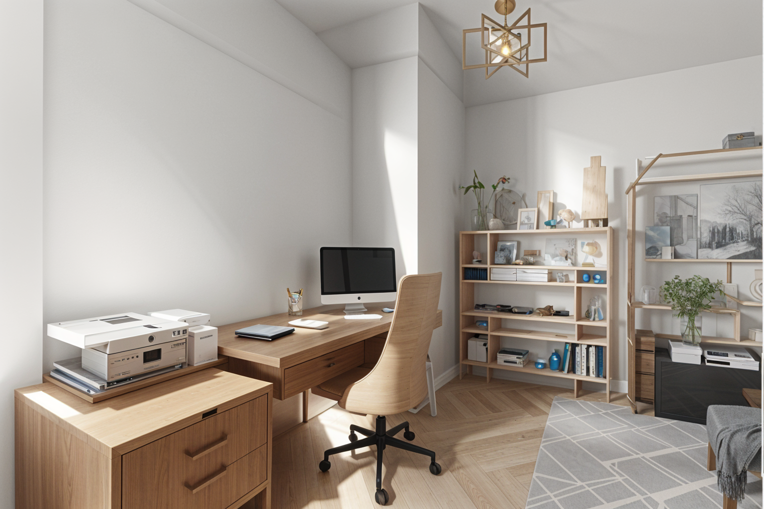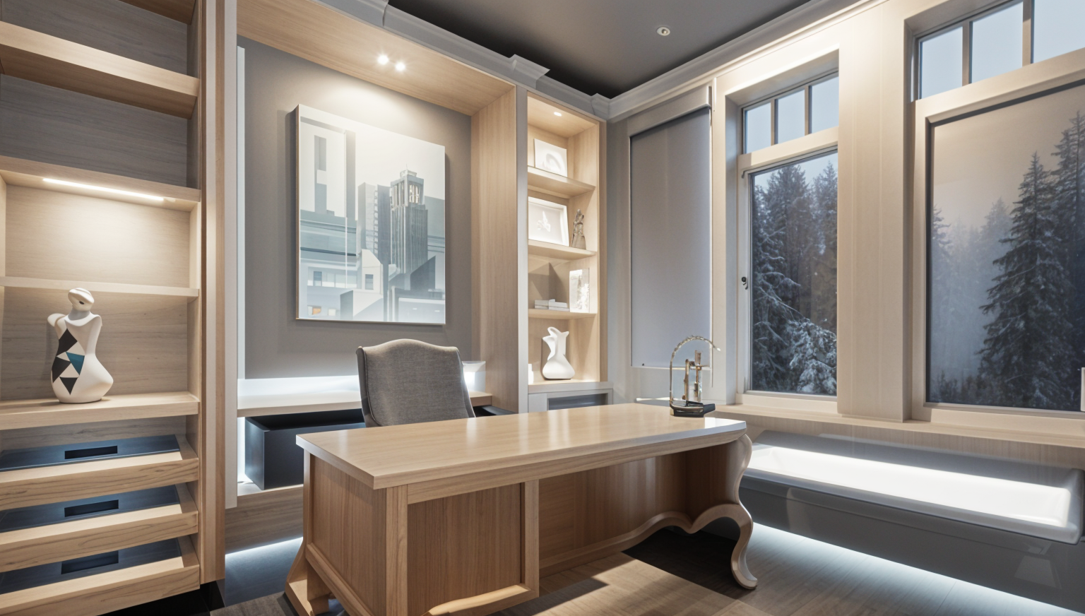 modernist interior shot modern home office in a vancouver condo large window with natural light mountain and ocean view in the distance minimalist scandinavian design white oak desk ergonomic chair indoor plants clean aesthetic soft daylight warm tones architecture