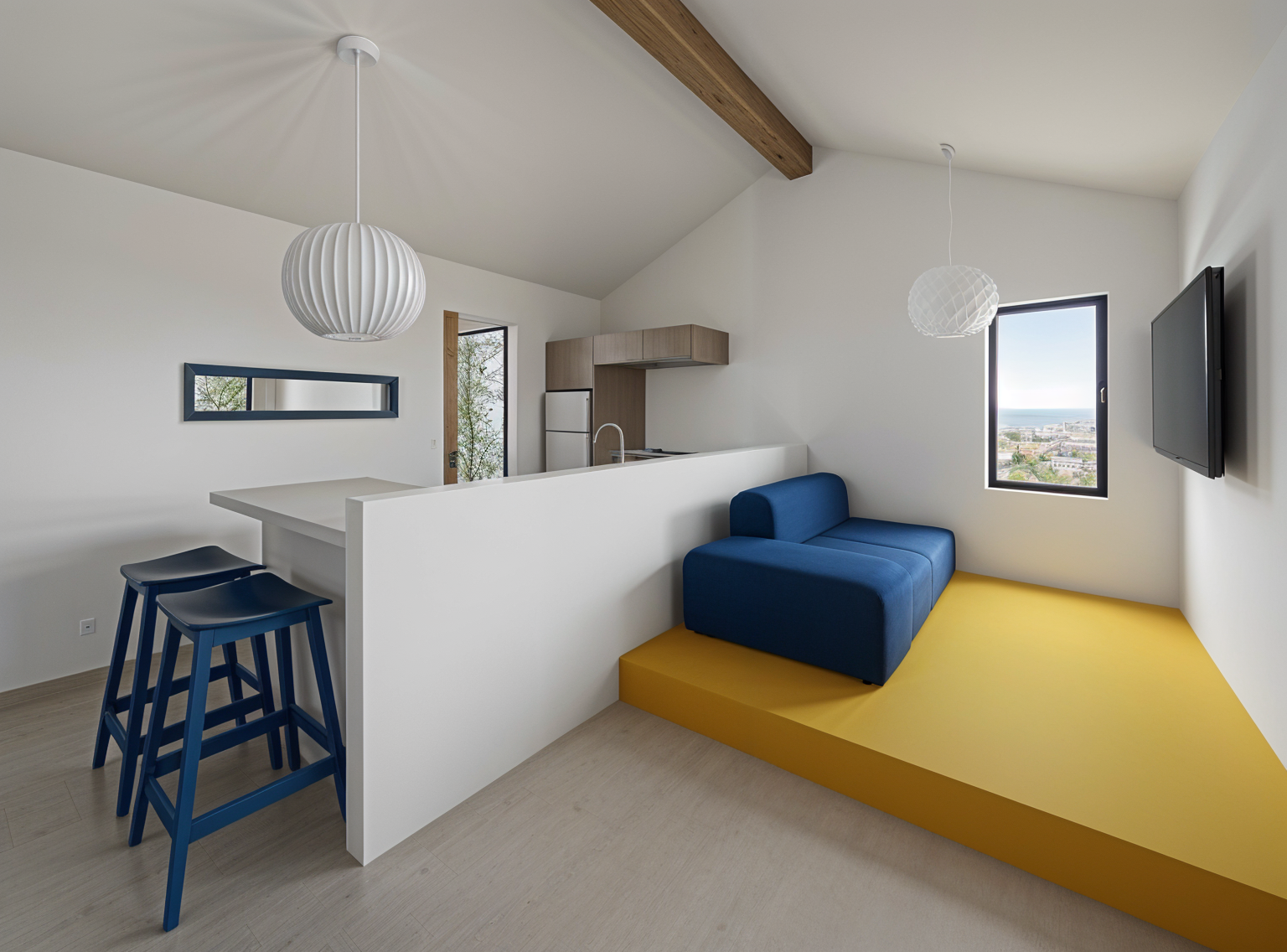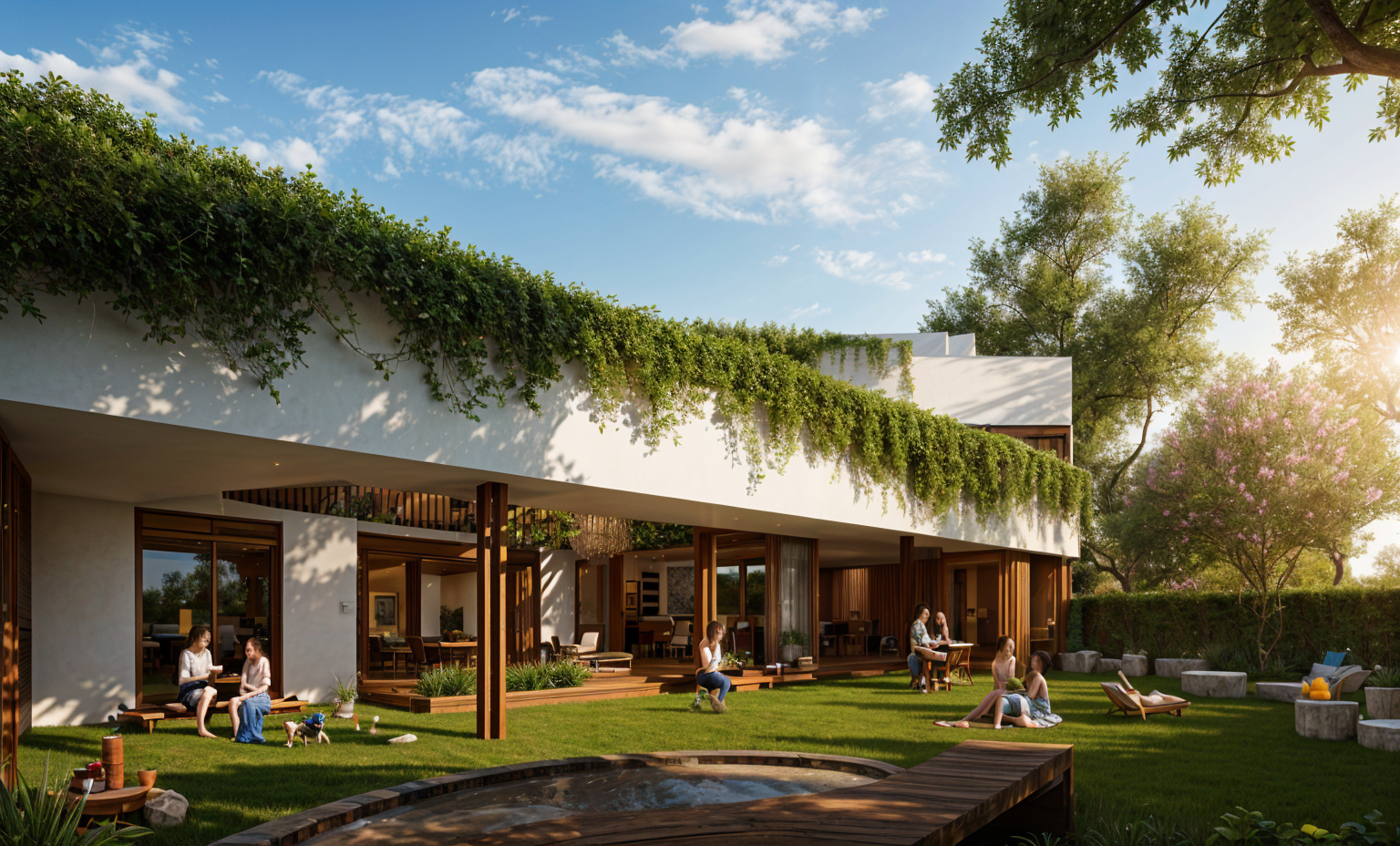 floors are concrete matte finish add daylight filling space from windows blend with ambient light celing is white time of day is golden hour change color of sofa to mauve change yellow to pine wood ceiling is white