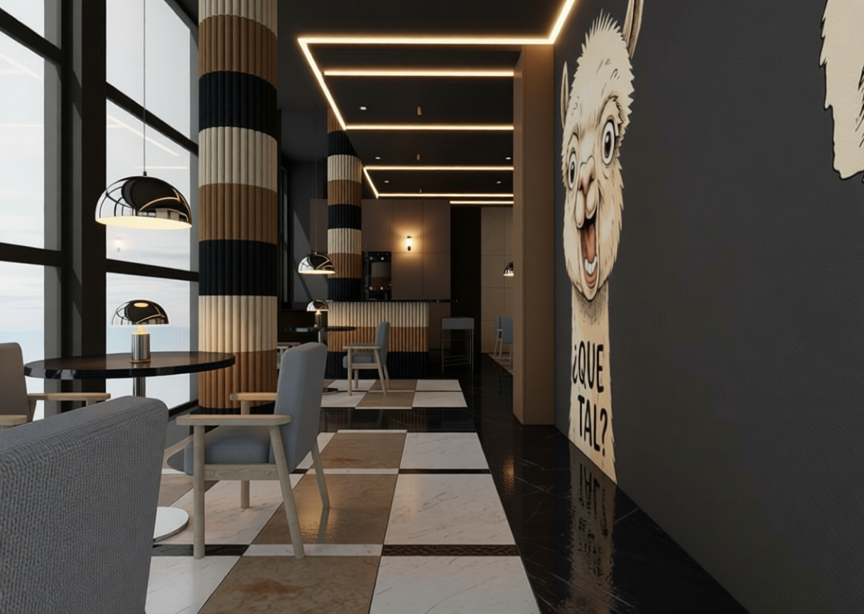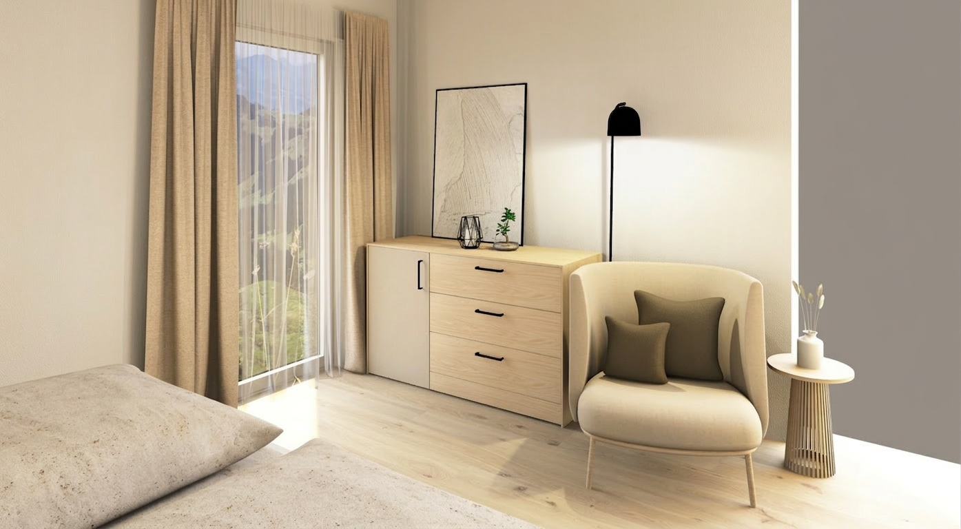 exterior shot keep the walls details from the second picture and decorate the room the same style as the first picture is the same room from different perspective keep the geometry of the room as it is in the second picture