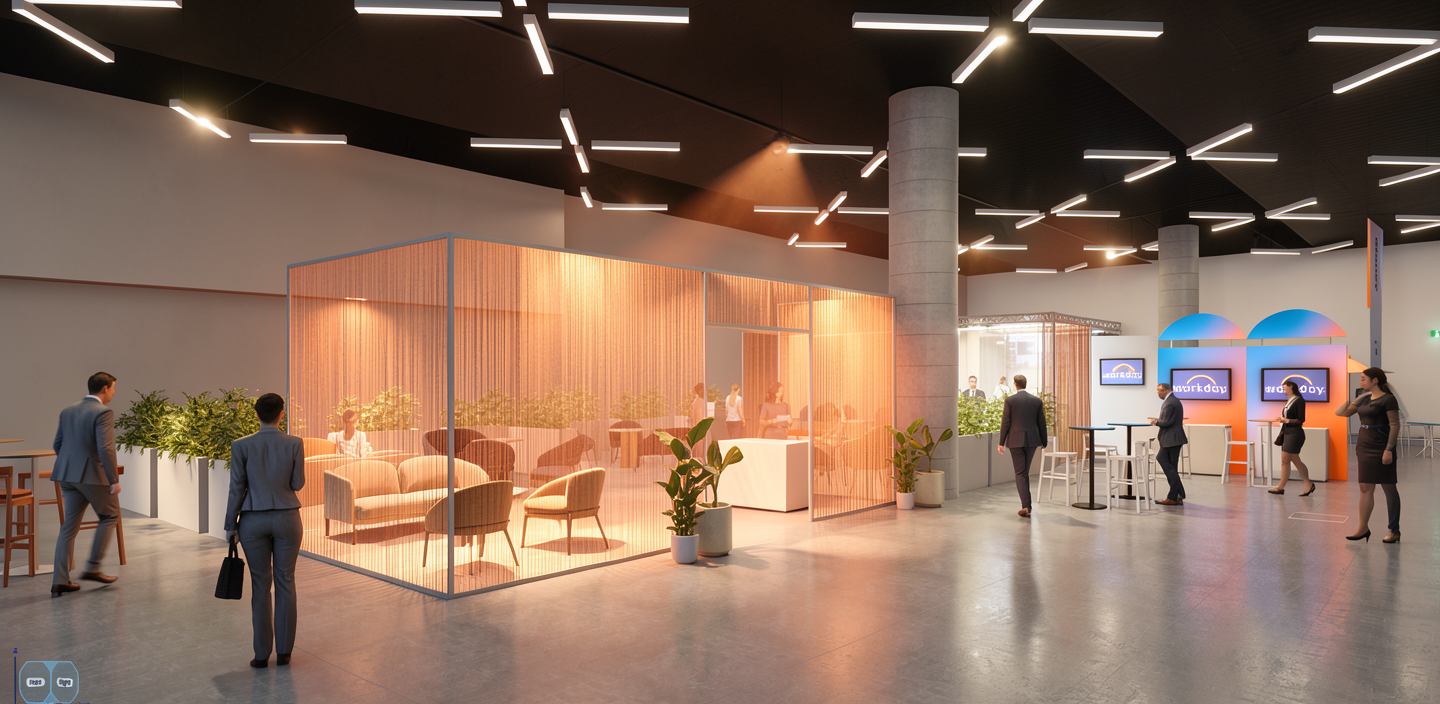 a modern exhibition hall business people walking around the room and seating on furniture soft medium lights spaghetti curtain with blue spotlight blue