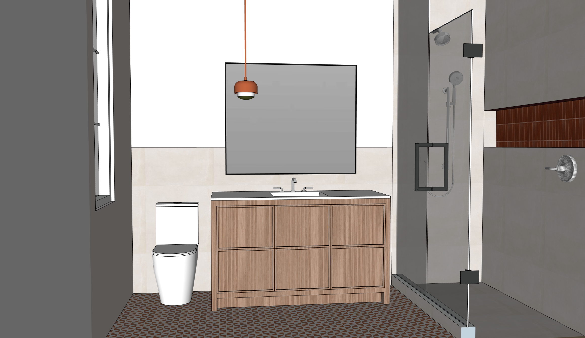maintain colours make sure countertop is white and the feeling is bright airy feel and the tiles are 30 x 30 chalk colour but add led to the shower niche