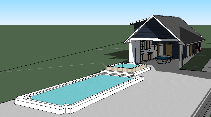 add natural lighting make look realistic add nice landscaping add furniture and potted plants there is an outdoor shower in the left hand corner of the building on the inside add a large and tall hedge on the left directly beside the building and at the rear of the building create a sloping grade from this patio up to 6 tall on the right side of the building extend the patio to the right