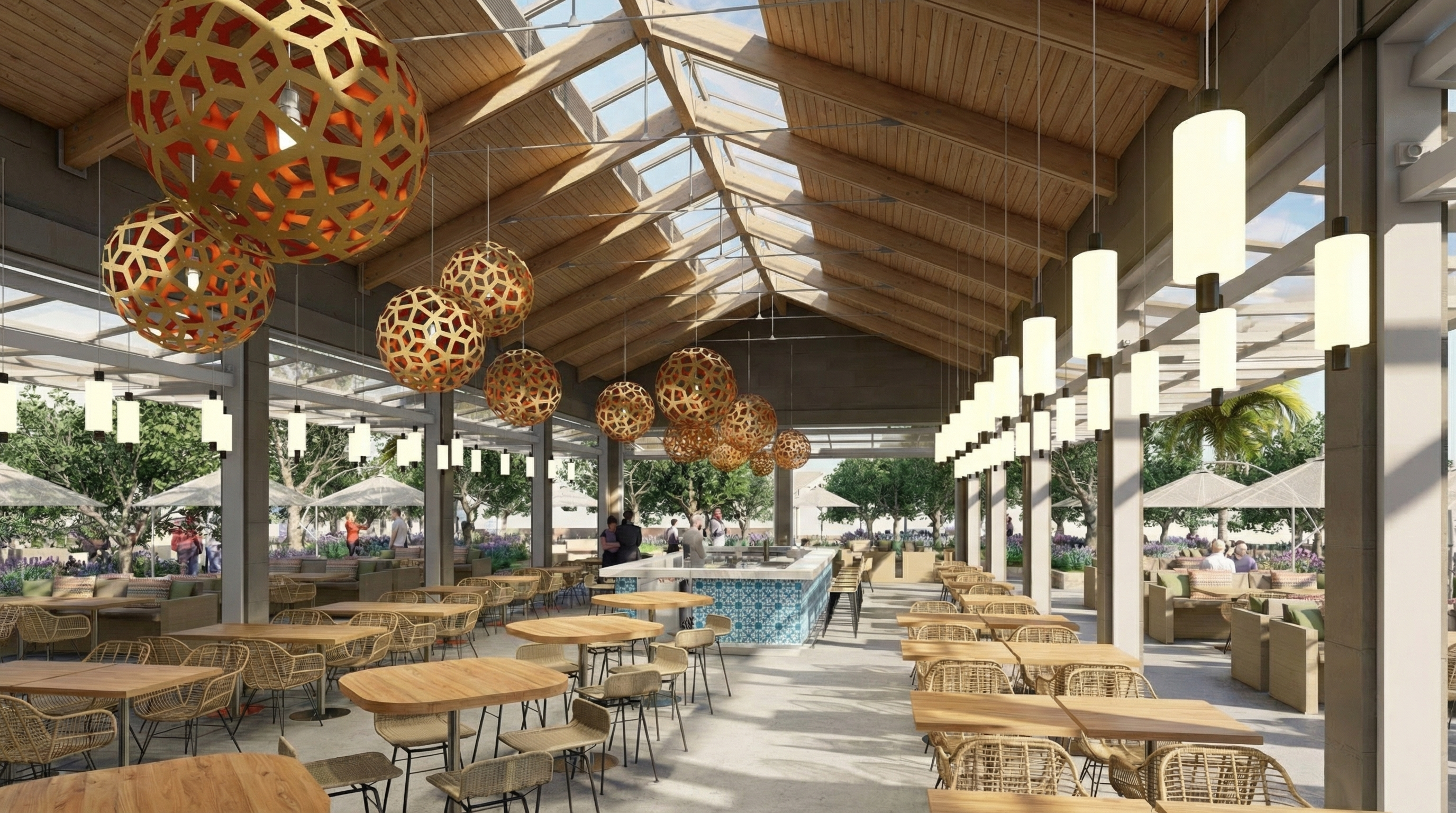 evening view enhance the materials and lighting effects in the input image add people sitting at the some of the tables having dinner dressed casually for a beach resort add some waiters serving the guests add some people at the bar having drinks add some lights in the trees outside