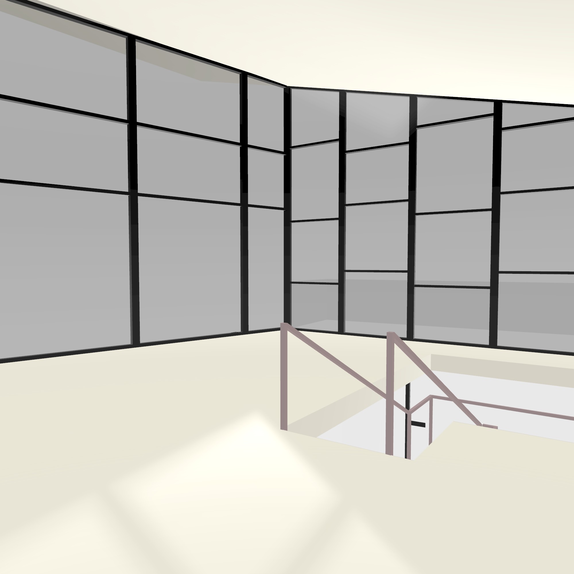 architectural watercolor rendering of a small contemporary research station interior bright dayroom with sloping ceiling and large floor to ceiling window framing rocky cliffs and misty pines beyond structure composed of warm wood black steel and glass crisp and realistic architectural detailing including handrails beams and glazing rendered with balanced watercolor textures visible pencil and ink linework and light technical annotations background dissolves into loose watercolor washes and white paper soft unfinished fade around edges calm morning light entering through the window casting subtle reflections and shadows precise yet painterly concept architectural visualization style with couches against window