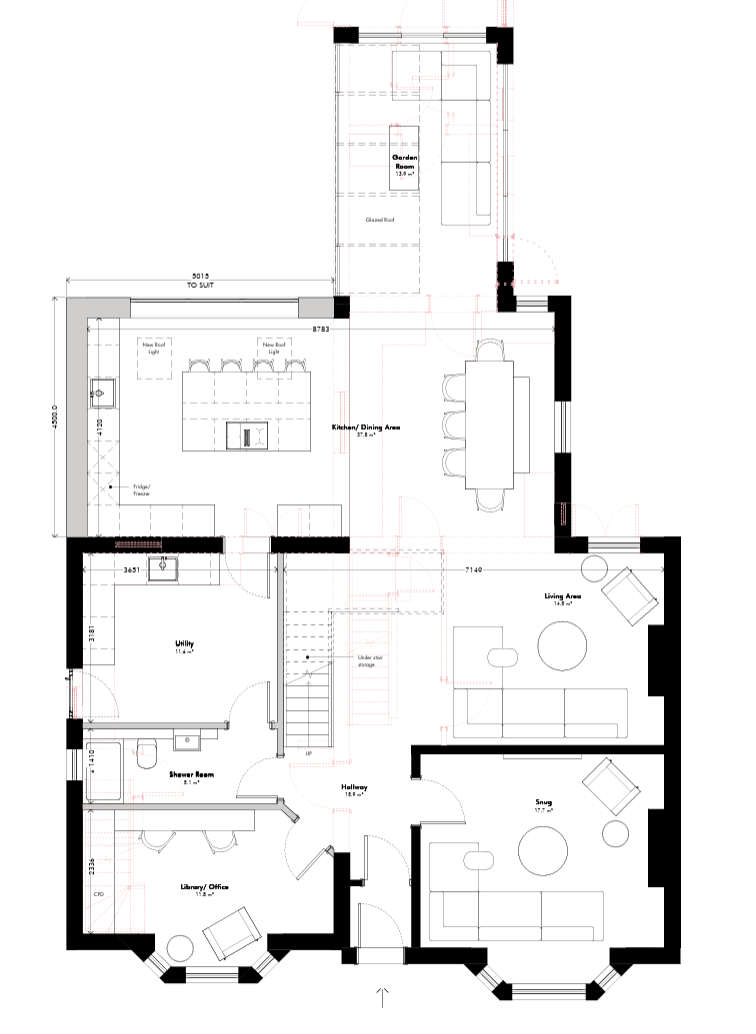 convert this floor plan into a realistic isometric 3d view of a full house show the space from an elevated angle with furniture walls and details visible the old plan is delimited in pink red lines ignore those use the same furniture as shows on the plan do not change the orientation of the floorplan