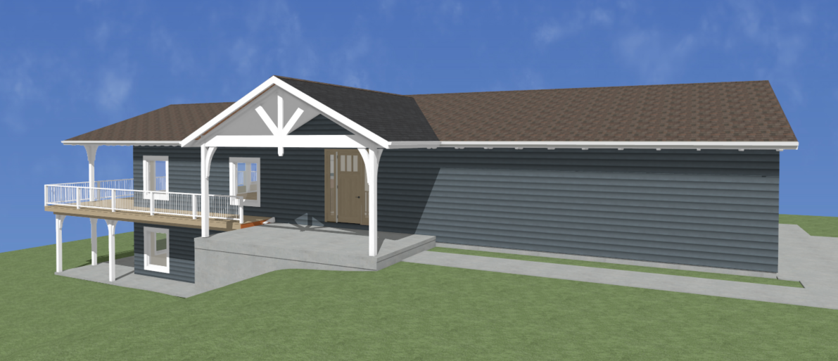 a grey blue cabin set on a downhill slope pine trees scattered behind with a blue lake behind it a manicured lawn with native plants a brown shingle roof and a light brown front door and deck the basement deck is concrete a soft blue sky with white clouds that softens the scene