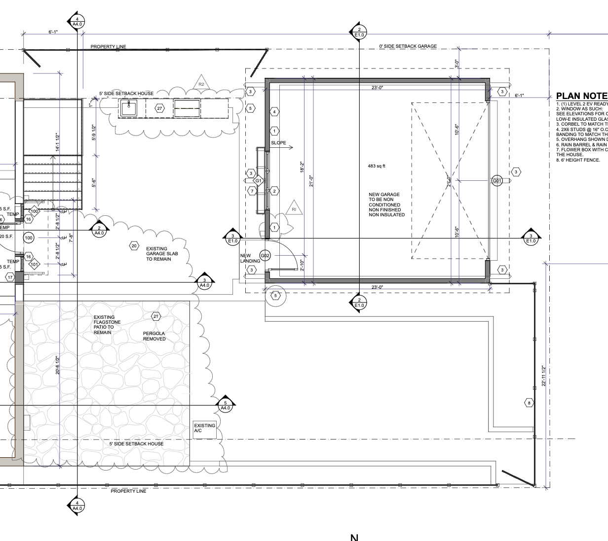 modern architectural rendering ofexterior facade daylight realistic materials minimal landscaping front orthographic view show garage dark black lines stone patio and grassy area to the right of it show border garden