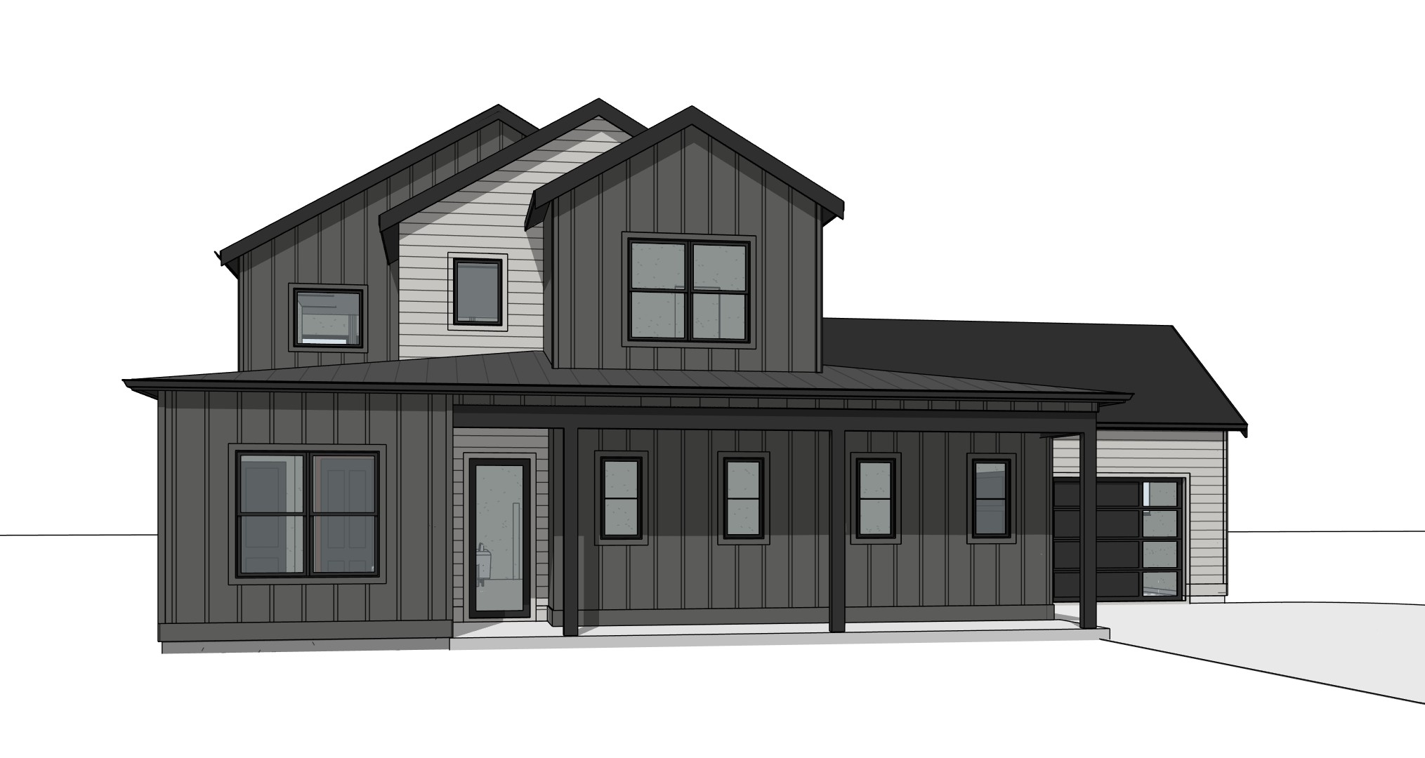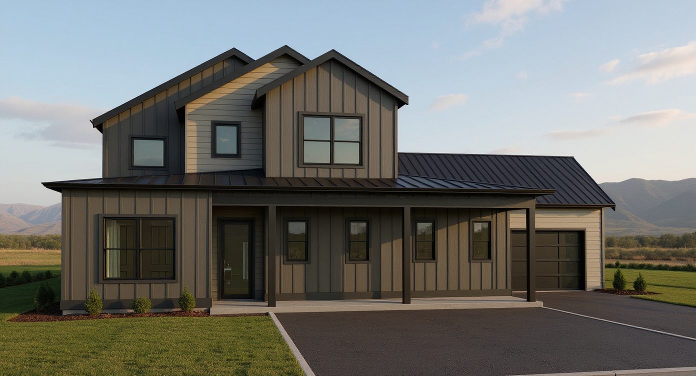 render a beautiful modern house with a charcoal gray exterior and contrasting light gray accents the roof is sleek matte black enhancing the contemporary style windows are black adding depth and definition surround the house with a lush green landscape and a clear blue sky capturing a serene and welcoming atmosphere during a sunny day low mountains in background of suburban lot add shrubs around perimeter driveway is asphalt