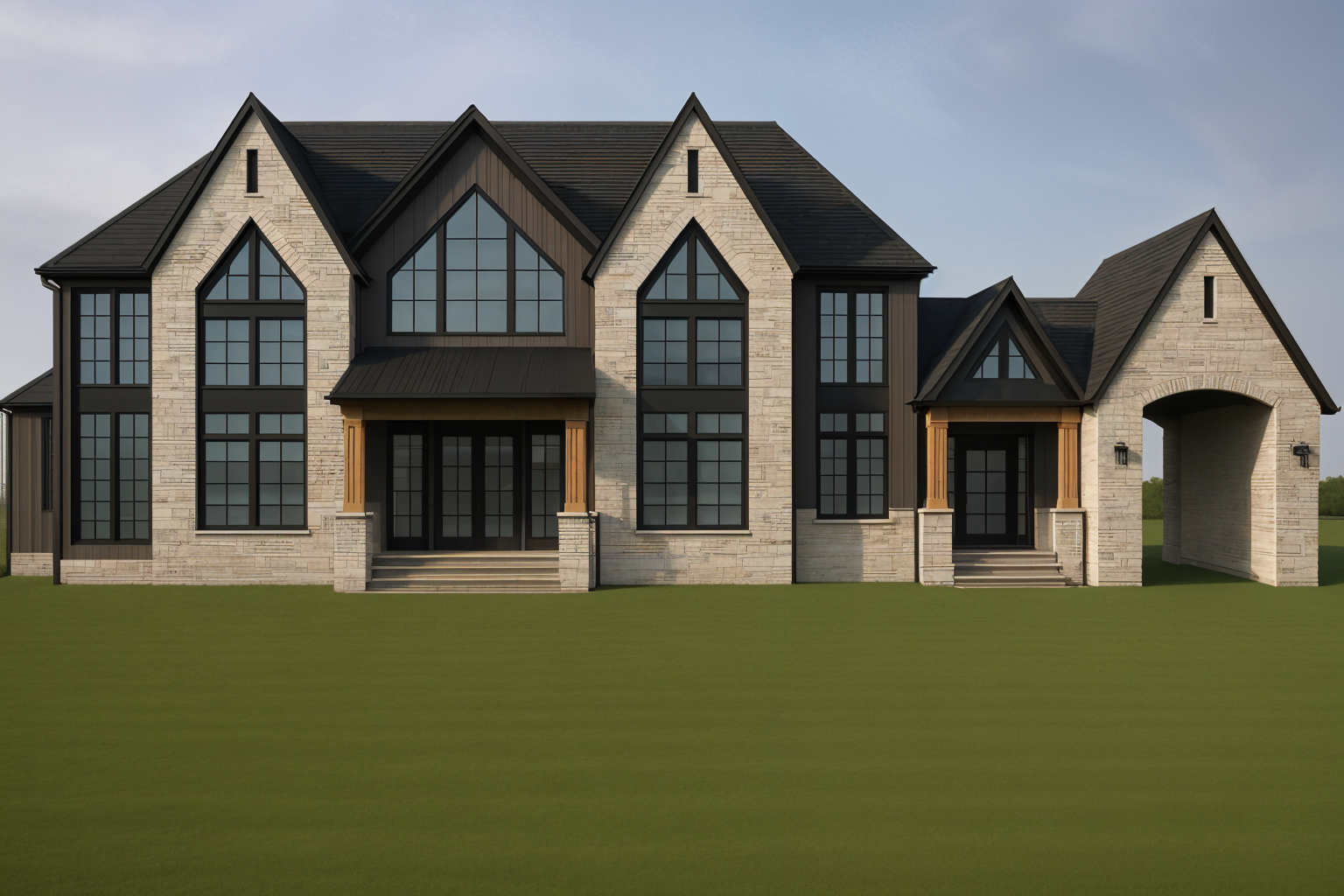 exterior shot render a modern two story house with a contemporary design the exterior features vertical wooden paneling in a light white color with grey accents the roofs are metal and painted in a sleek charcoal dark gray large windows with white frames create a sense of openness and light the garage door is modern and minimalistic matching the charcoal dark gray roof the balcony has sleek glass railings surround the house with a lush garden featuring vibrant green grass colorful flowers and tall trees the atmosphere is serene and inviting with a clear blue sky and gentle sunlight filtering through the trees architecture