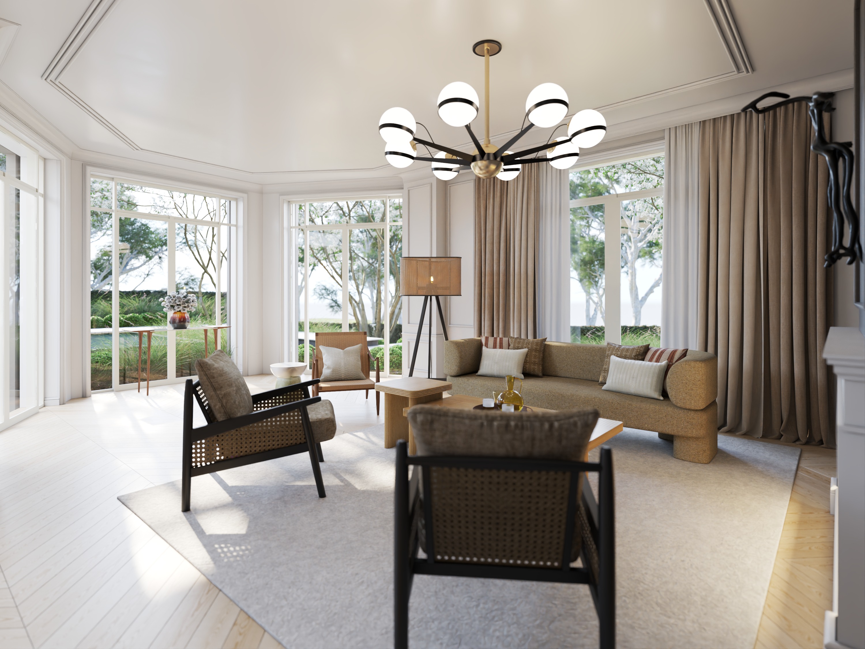 enhance the realistic texture and morning dawn lighting with interior lighting turned on with soft light maintain the elements material and angle of the picture make the outdoor vegetation look dominating over all view maintain the shape of otdoor vegetation