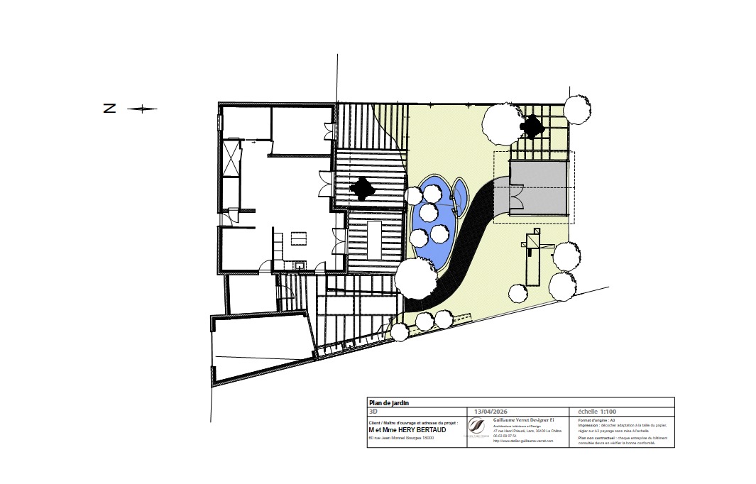 transforme ce plan en plan d am nagement ext rieur contemporain avec v g tation r aliste textures de mat riaux ombres douces massifs structur s bassin mis en valeur et une ambiance l gante et naturelle style plan paysagiste professionnel