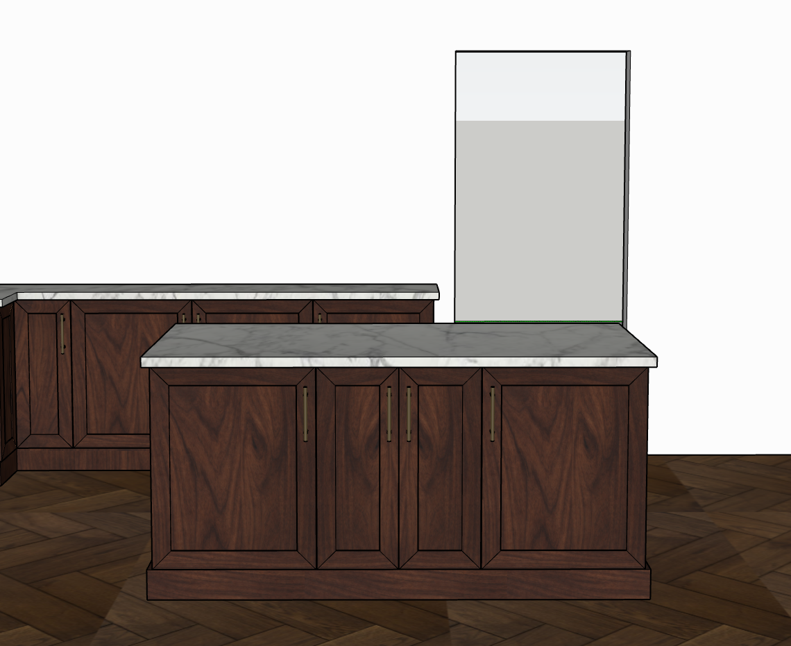 this is a beautiful walk in closet for a master bedroom the cabinets are made of a natural stained knotty walnut the cabinets are all 12in deep with flush base trim along the bottom the floors are a beautiful hardwood and the countertops are white marble there are basic clothes hanger rods above the countertops the door to the left is a standard interior door