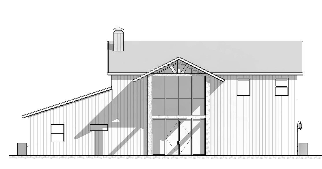 archsynth generation input image dark gray burnished gray sheet metal roof white vertical sheet metal siding natural oak wood post black window trim and roof trim the atmosphere is serene and inviting set against a backdrop of pastel blue sky with hints of golden sunlight the scene is surrounded by lush greenery enhancing the tranquil ambiance