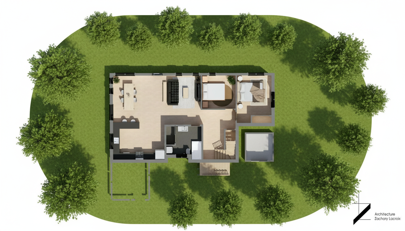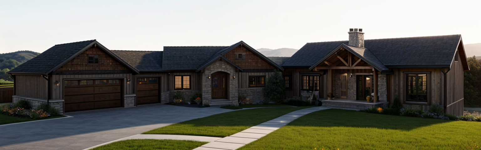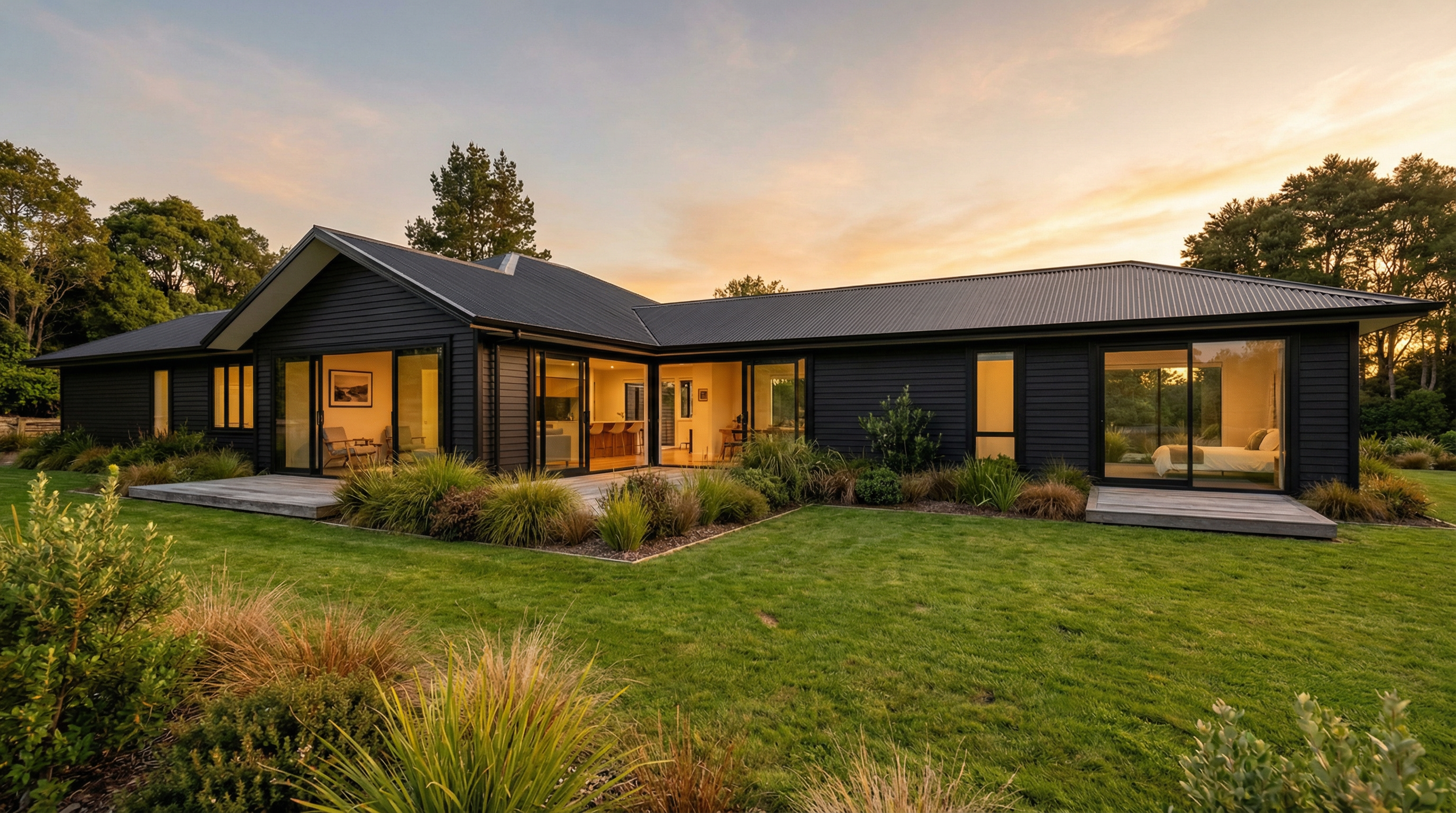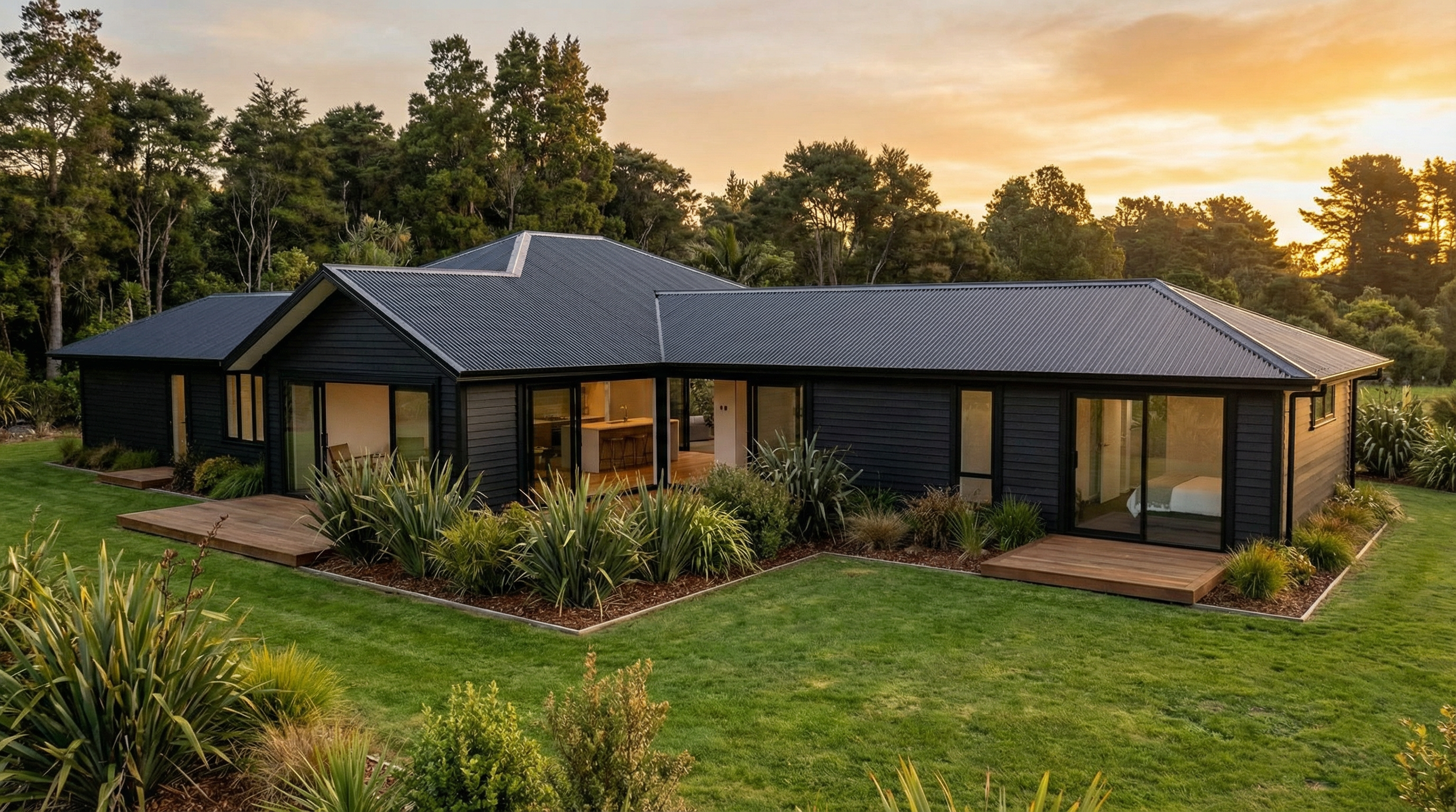 black weatherboard cladding black roof black window frames remove vertical post in corner sliding door lawn low timber decks extensive native planting background trees sunset