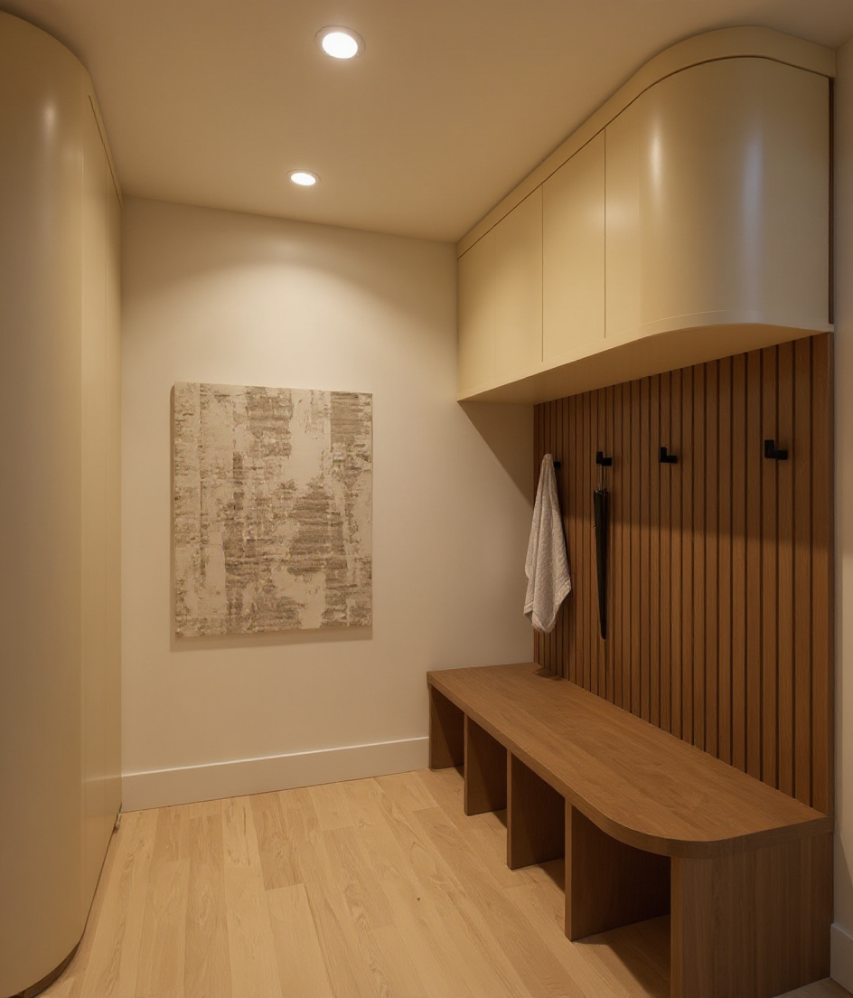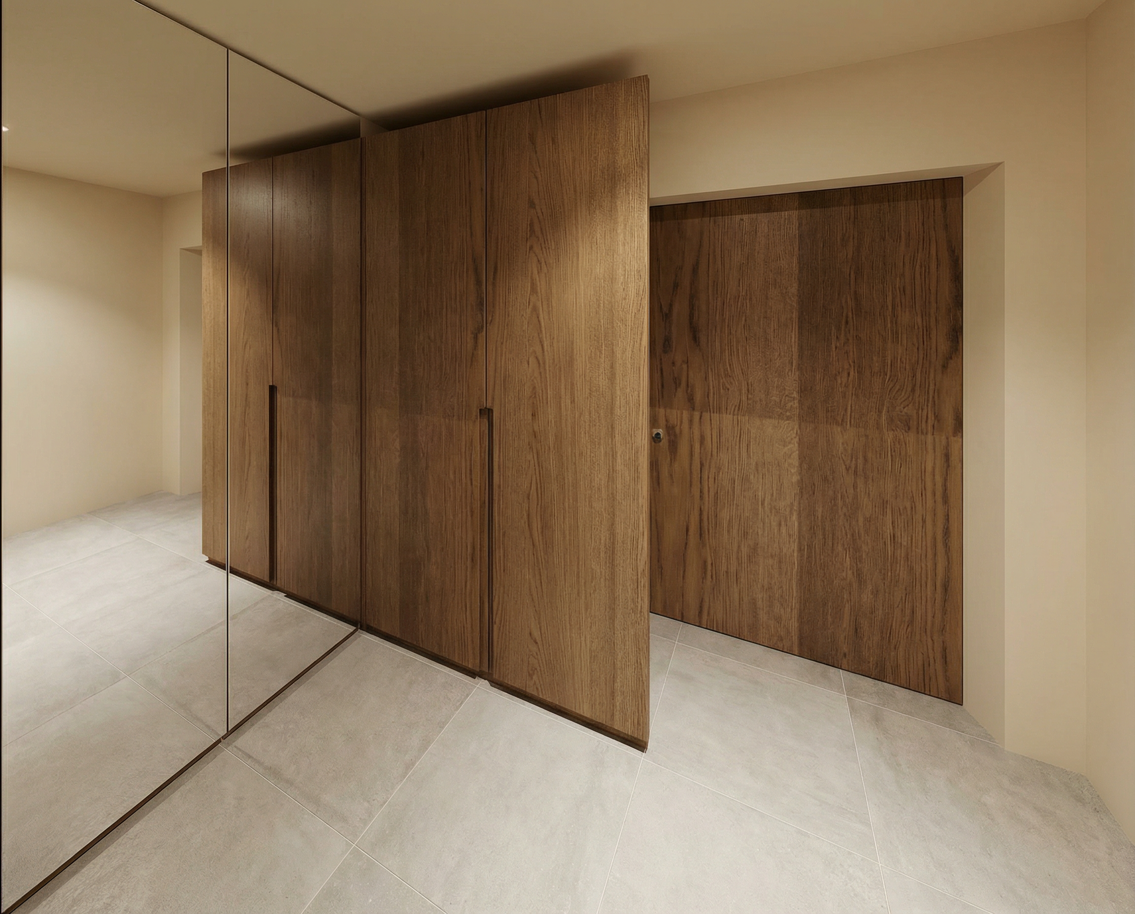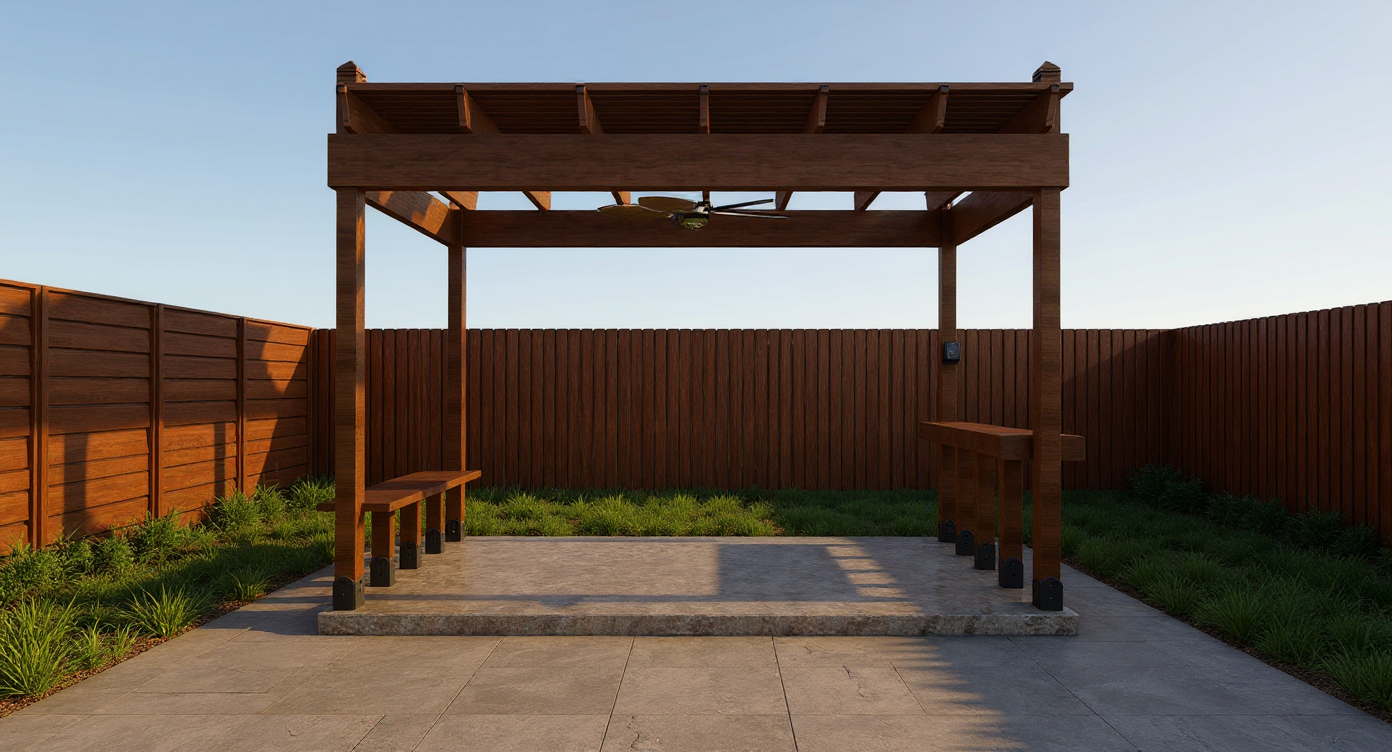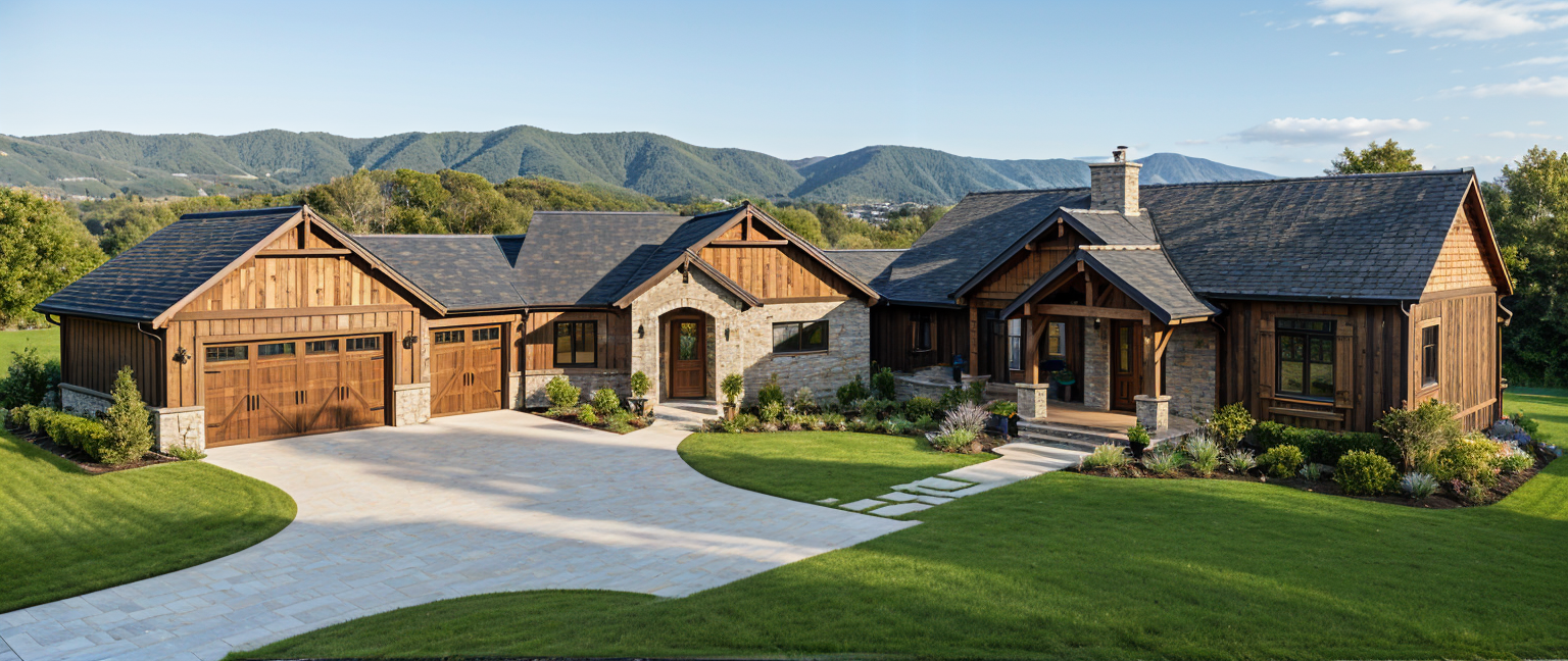 black weatherboard cladding black roof black window frames remove vertical post in corner sliding door lawn low timber decks extensive native planting background trees sunset
