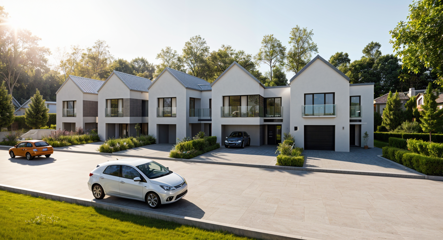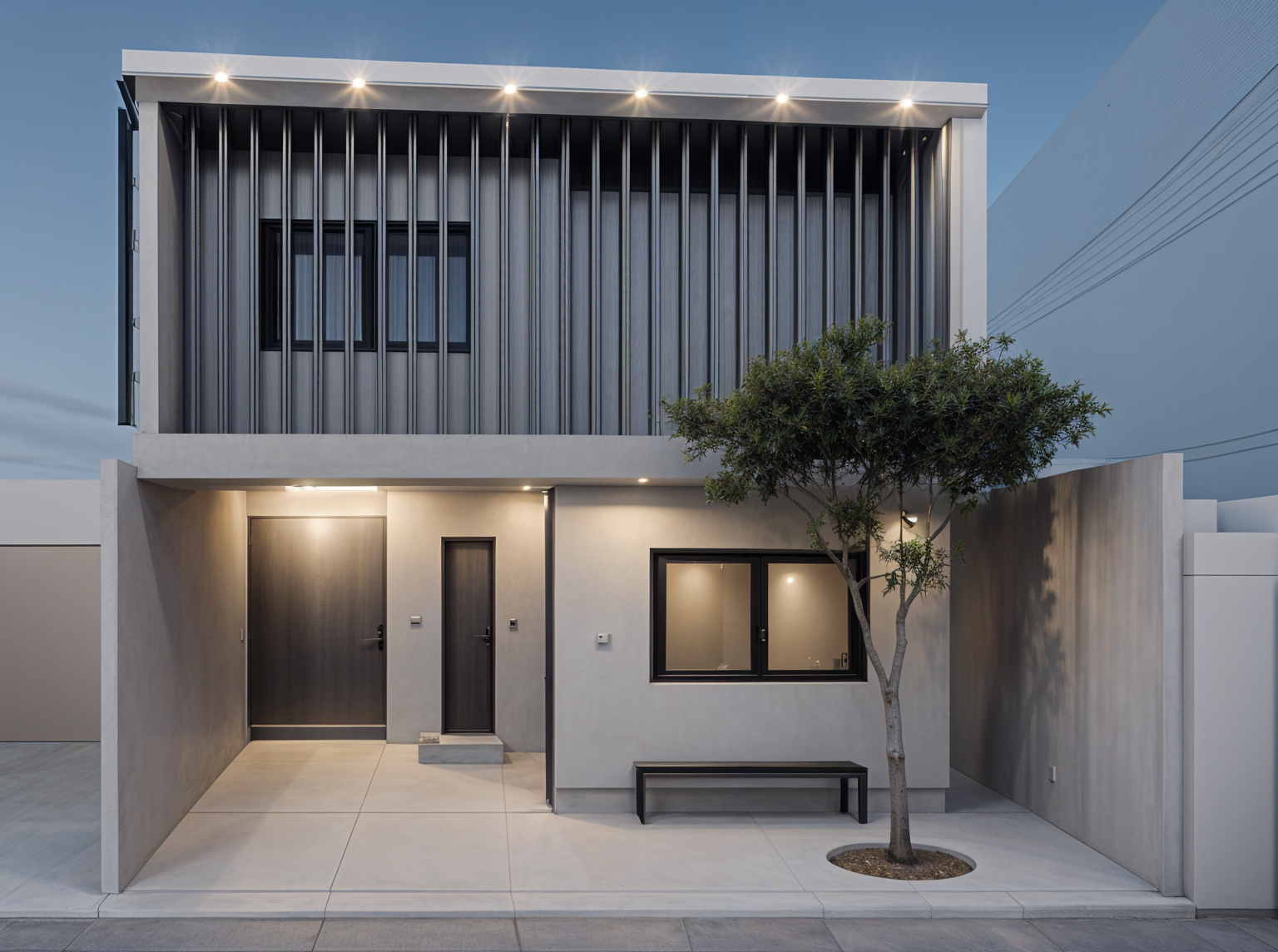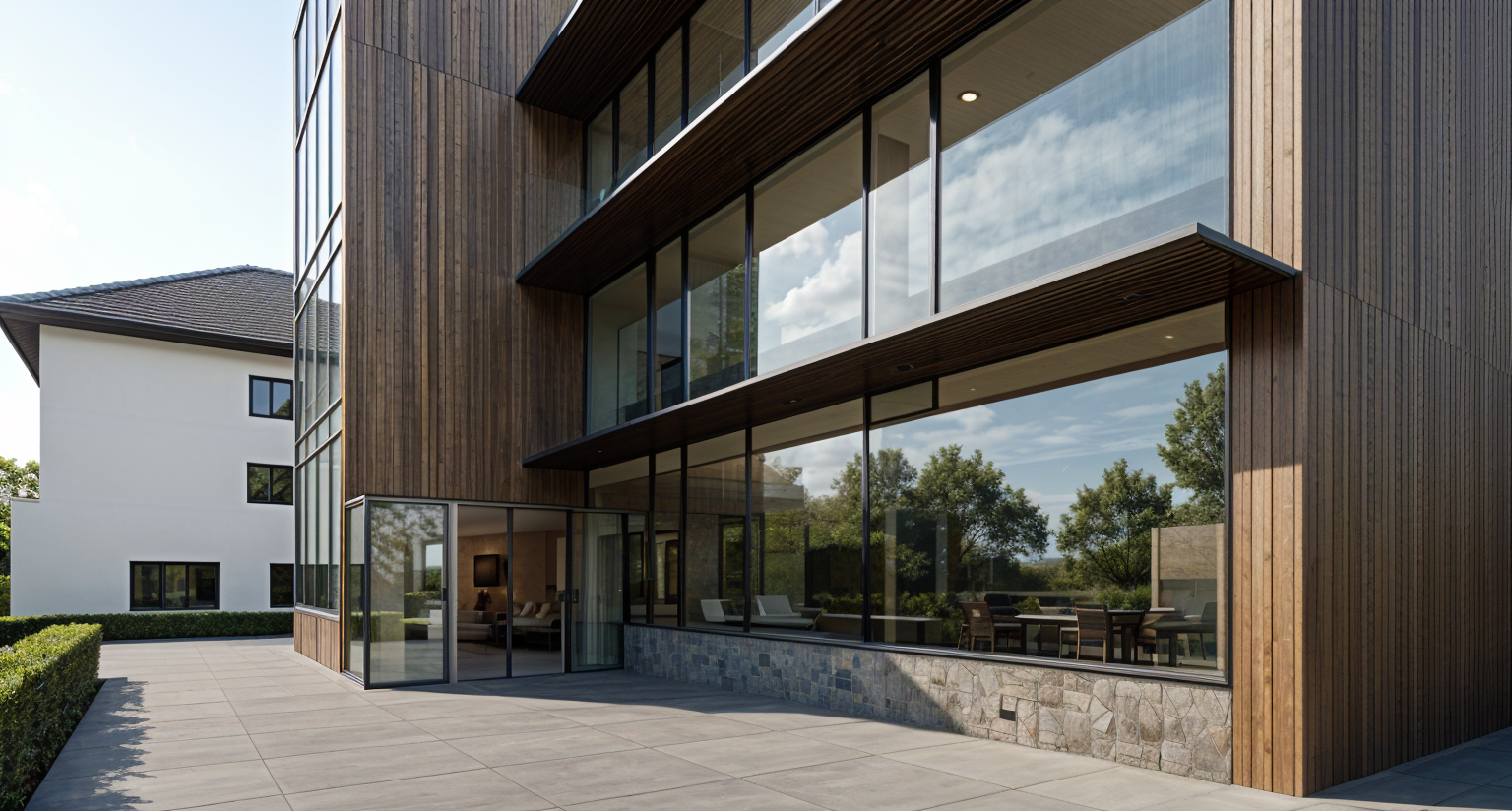 bright fascade modern architecture office building surrounded by bushes trees reflections in the windows inside desks chairs seen through the windows no lounge chairs chairs made of brushed inox tables made of glass surfaces and brushed inox legs sunlight coming in equipment seen through the windows benches and greenery in front of the building