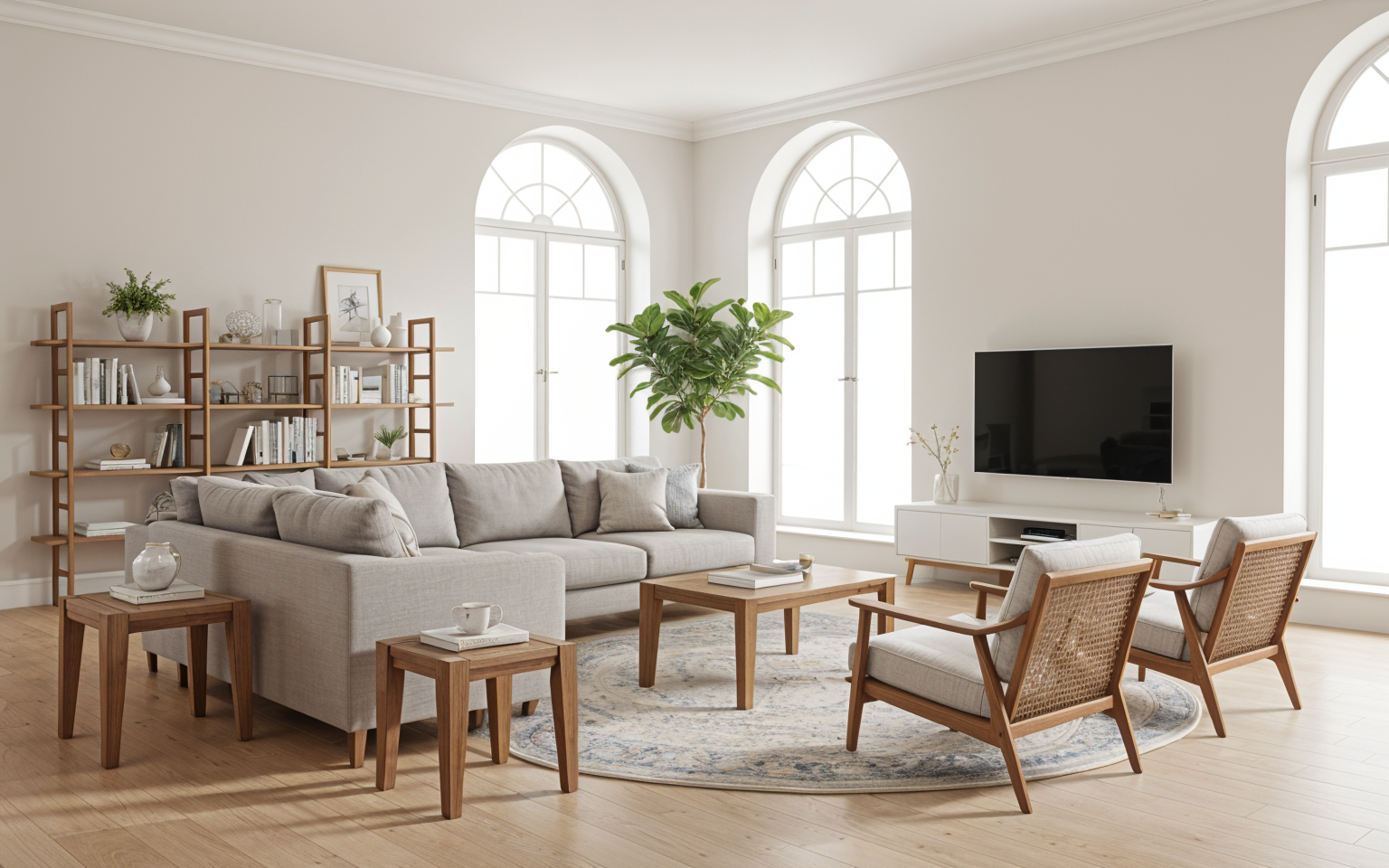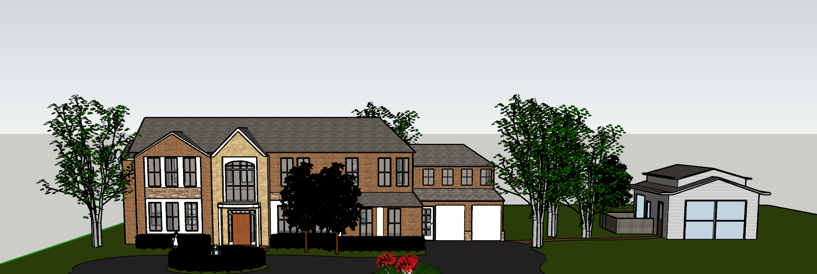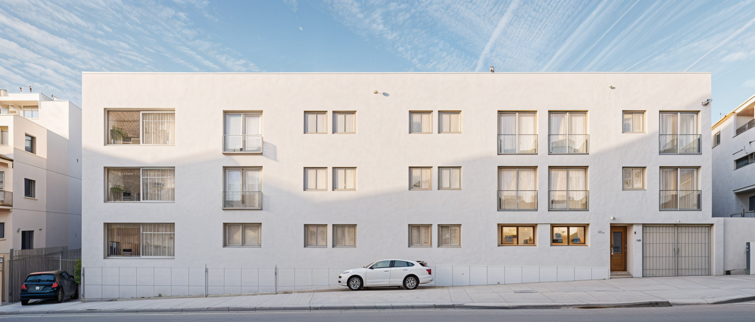render a modern architecture scene featuring a contemporary building with sleek lines and a silhouette sculpture in the foreground the building has a silver gray metallic facade and large windows with warm golden lighting from within the pavement in front is tiled with varying shades of light gray lush green grass and vibrant purple lavender bushes border the pathway the atmosphere is serene and peaceful during a clear blue twilight sky with soft ambient lighting creating subtle reflections on the surfaces include a few people casually walking adding a lively yet calm ambiance to the surroundings
