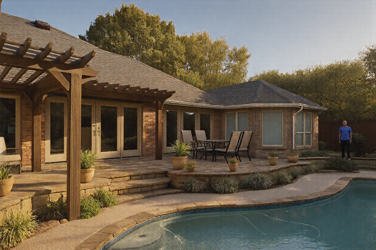 brick warm orange and red gray roof wood trellis screen porch rafters swimming pool foreground one story house
