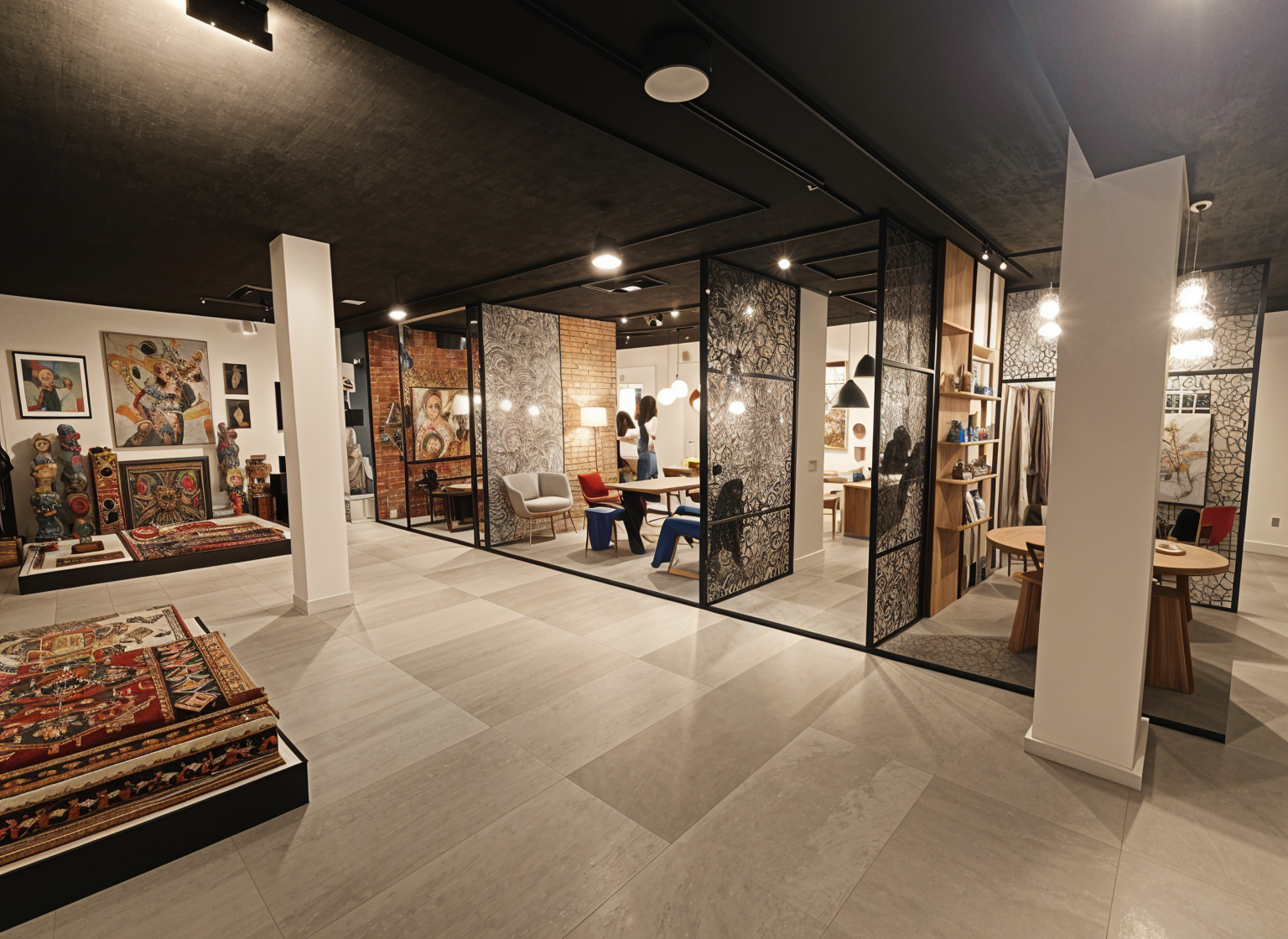 artistique wide angle shot furniture and home accessories showroom colorful and artist design many small partitions each partition for only 1 supplier rugs partition artwork partition lighting partition furniture partition wall textures home accessories partition add artistique partitions to separate every supplier black ceiling grey floor no windows