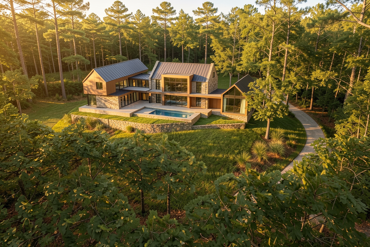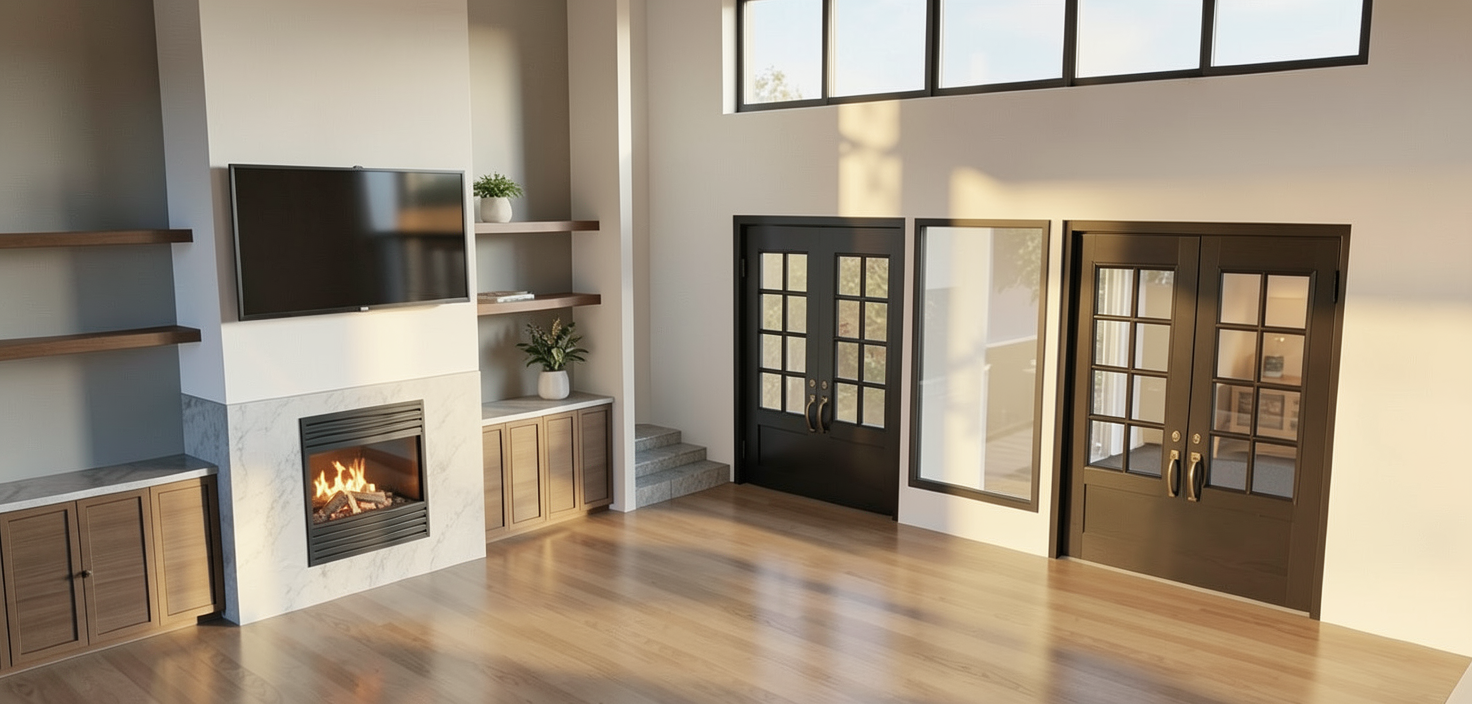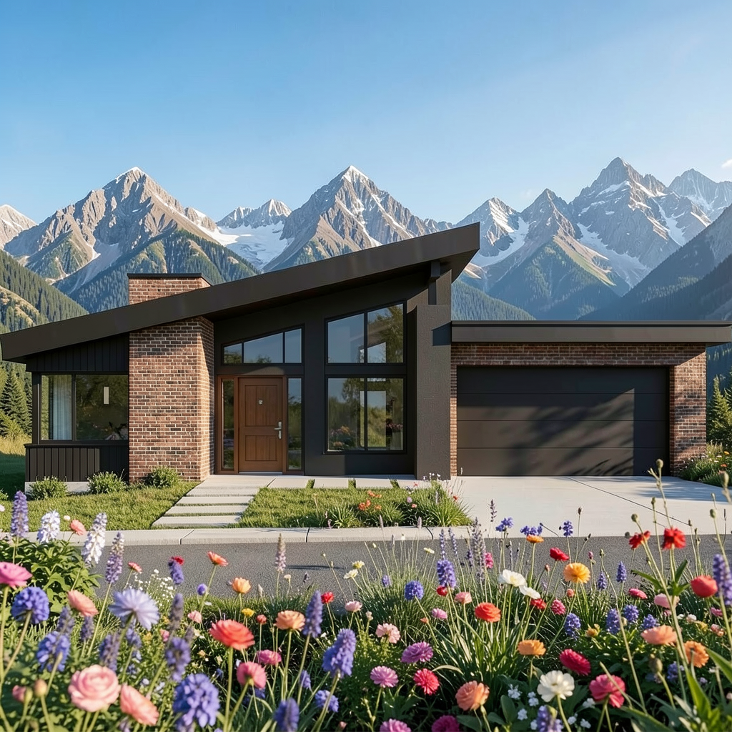 this elevation shows tall 3 story volumes containing windows these should all be rendered entirely in white cement board batten the two story sections that contain the entry doors and one small window each should all be rendered in common brick the third story sections above the brick should be shown in charcoal lapped cement board siding all window trim and accents should be black