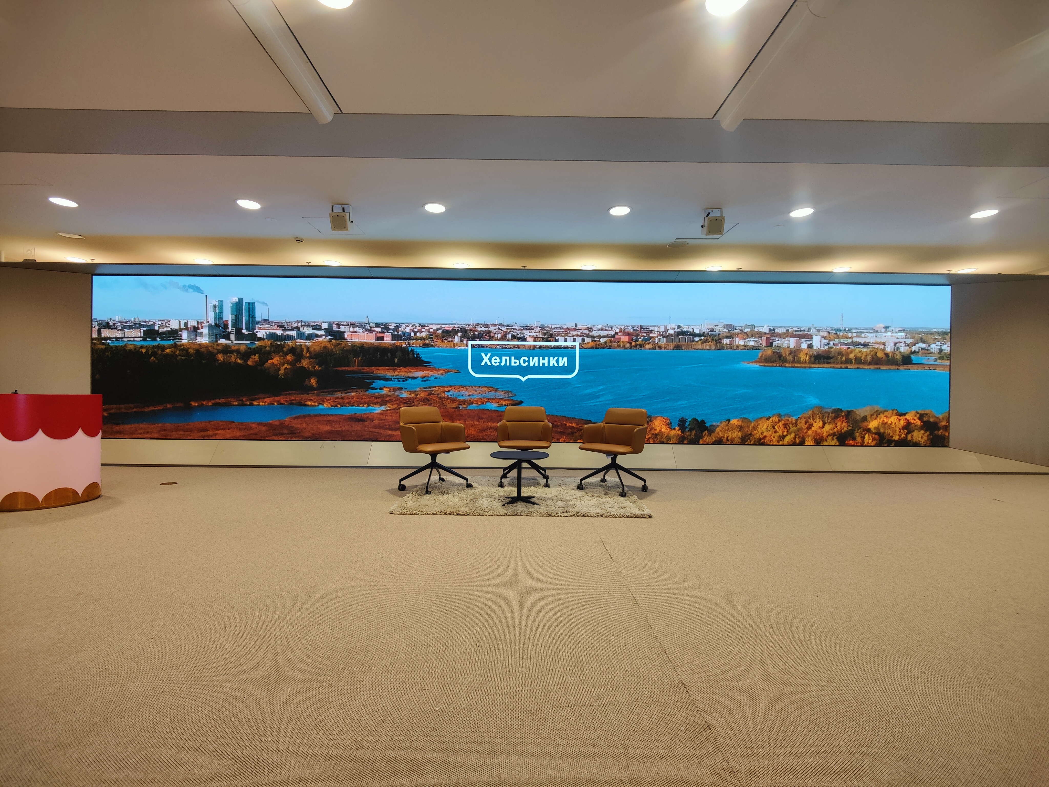 replace the content on the screen with big text team finland day 2026 blue text on white backround in front of the screen there is a low stage only 10cm with four nice chairs for panelists on the stage there is stylish blue carpeting