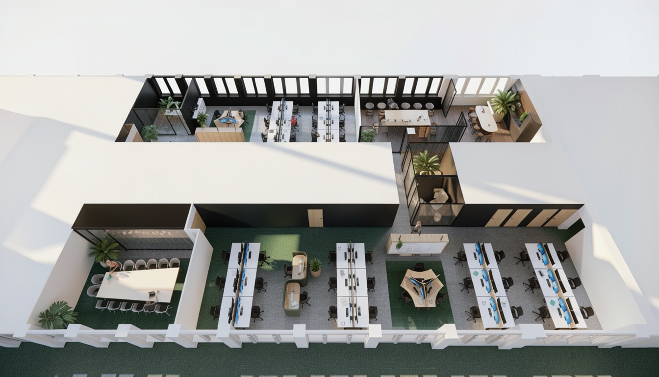 modern meeting room with white walls and glass partitioning light beige curtain grey carpet flooring with and dark green gradiant