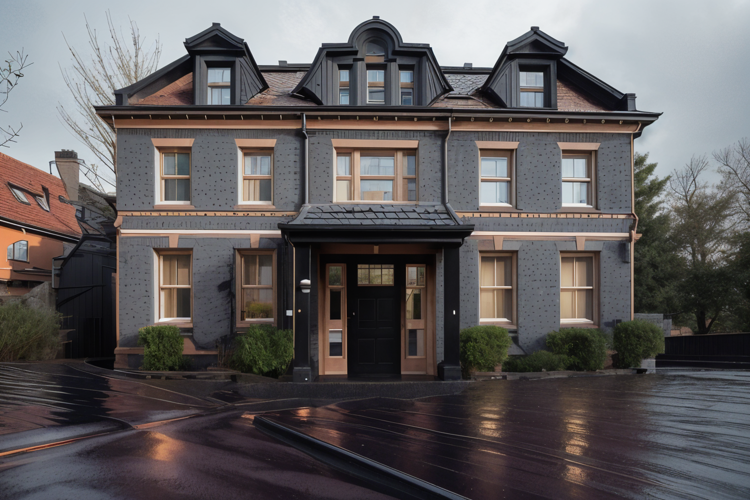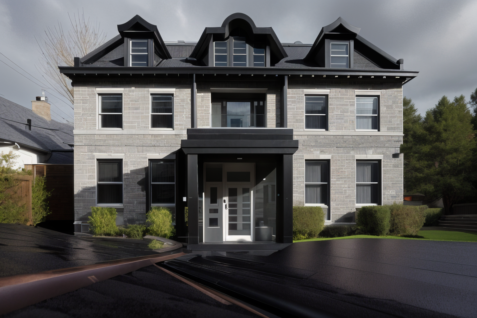 modernist exterior shot make the exterior black roof grey and make the rain gutters copper architecture