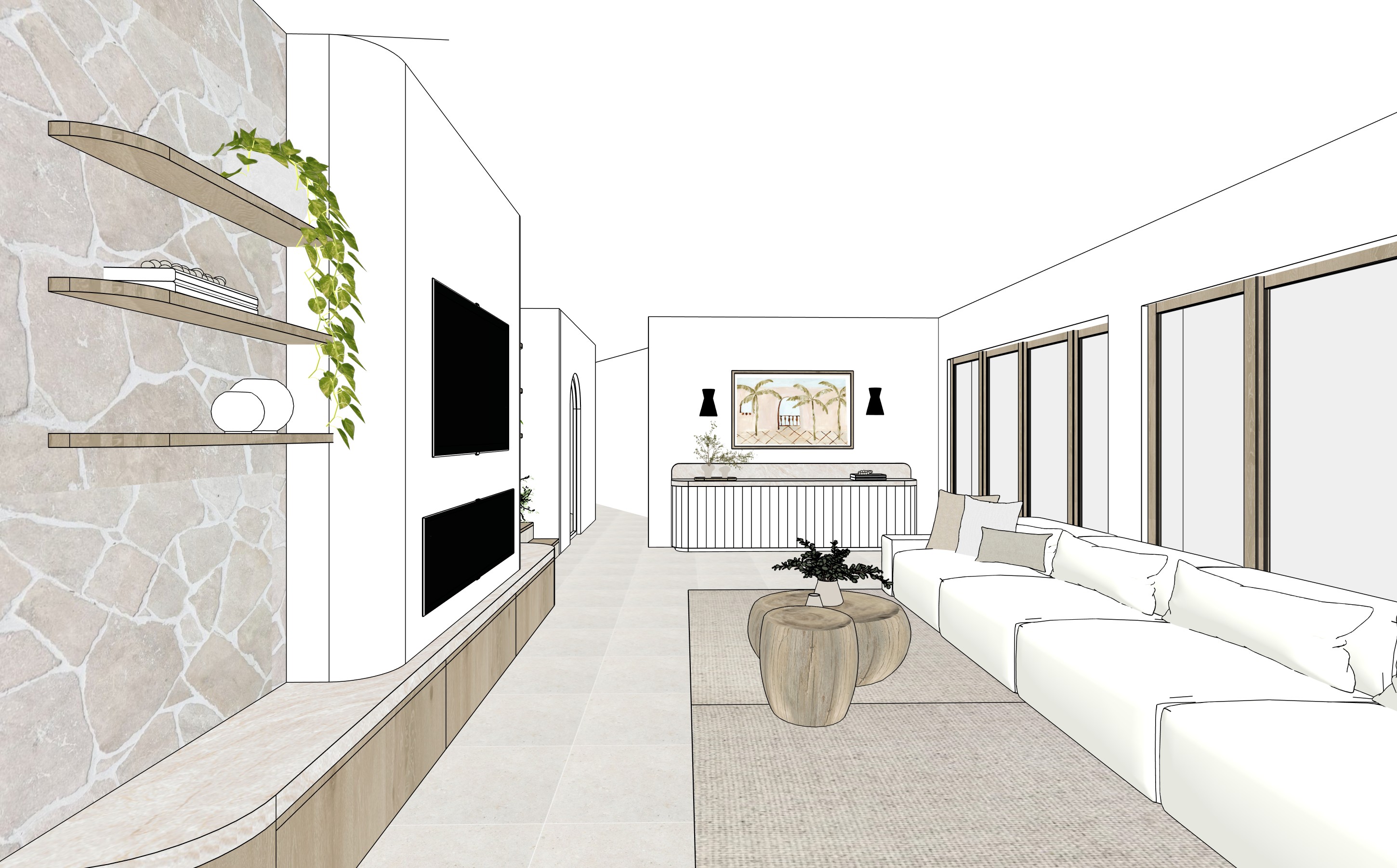 wall lights are rattan https hellotrader com au collections lighting products sabi wall sconce make crazy stone wall have a rough surface vj panelling on sideboard to be white add a water front view with landscaping this project is 23a yellambie st yowie bay nsw this room is slightly elevated on the hill and there is a verandah that runs around the window with timber post and wire balustrade taj mahal stone light oak timber rug is this https armadillo co com shop all winnow