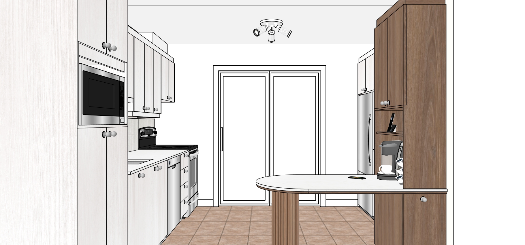 could you create a photorealistic rendering of an apartment kitchen the original cabinets are white with a tone on tone wood effect the countertop is vicostone polaris quartz the backsplash is new a large 40 cm x 120 cm 16 in x 48 in textured tile from centura s integra collection in pearl the wood look cabinets are new they are tafisa melamine color l592 the base of the small island is made of walnut look wood slats matching the tafisa melamine the appliances faucet and sink are stainless steel the cabinet door handles are brushed dark gray the floor tile is original and should be render as it is