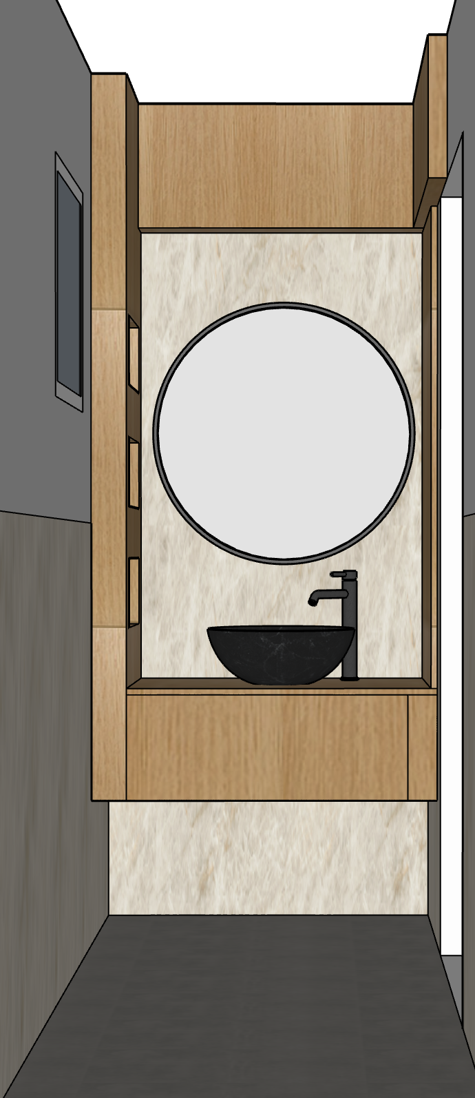 the size of the rooms are width 984 mm length 2254 mm and heigth 2400 mm the window frames are white and the door is white the tile is atlas concorde marvel diva taj majal matt 60x120 vertical layout the mirror wall is tiled all the way up all the other walls are tilen until 1200 mm above this the walls are painted in light greige the vanity is made of oak veneer the drawer width is 800 mm the are led strips in the ceilings of the shelf niches there is light behind the mirror
