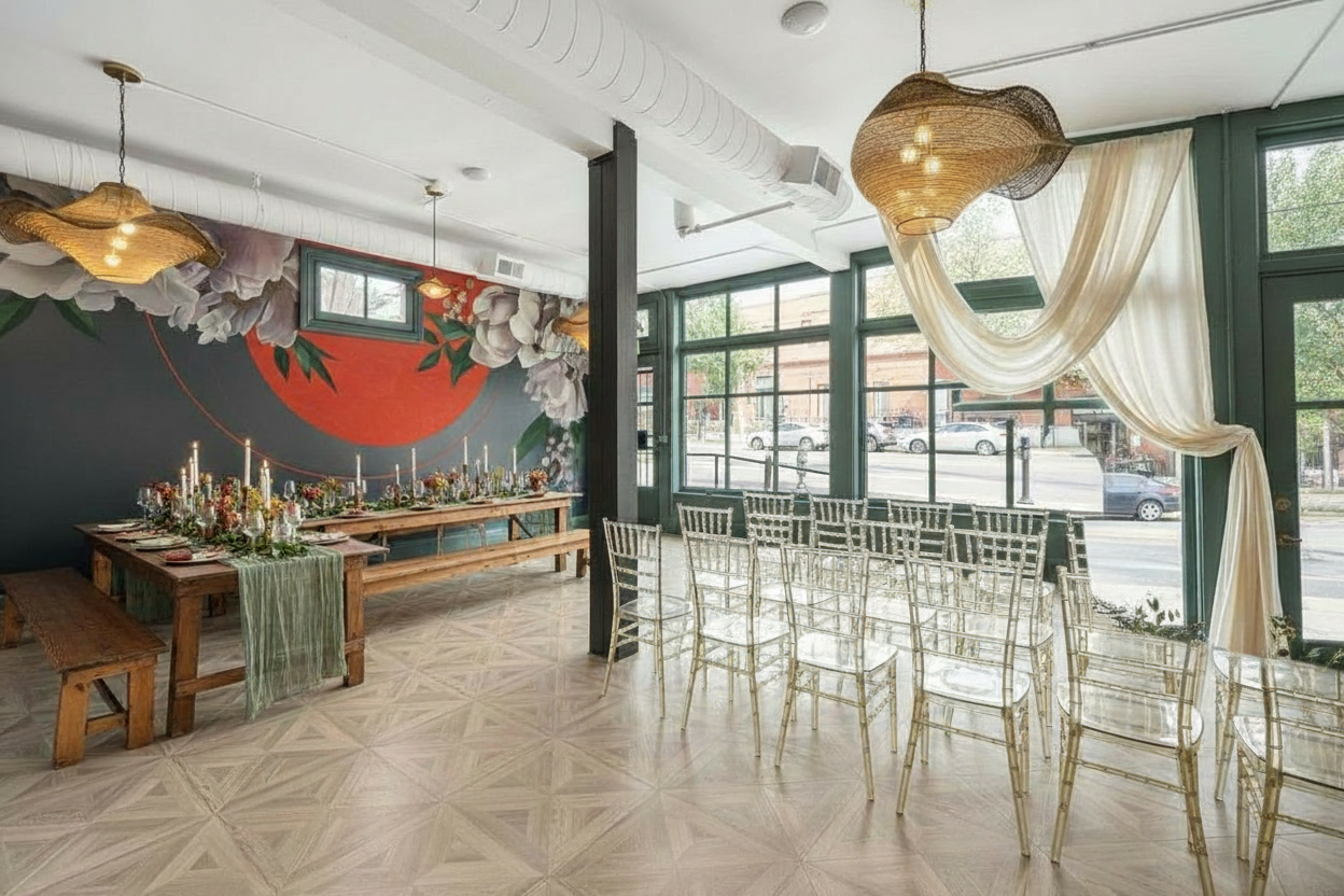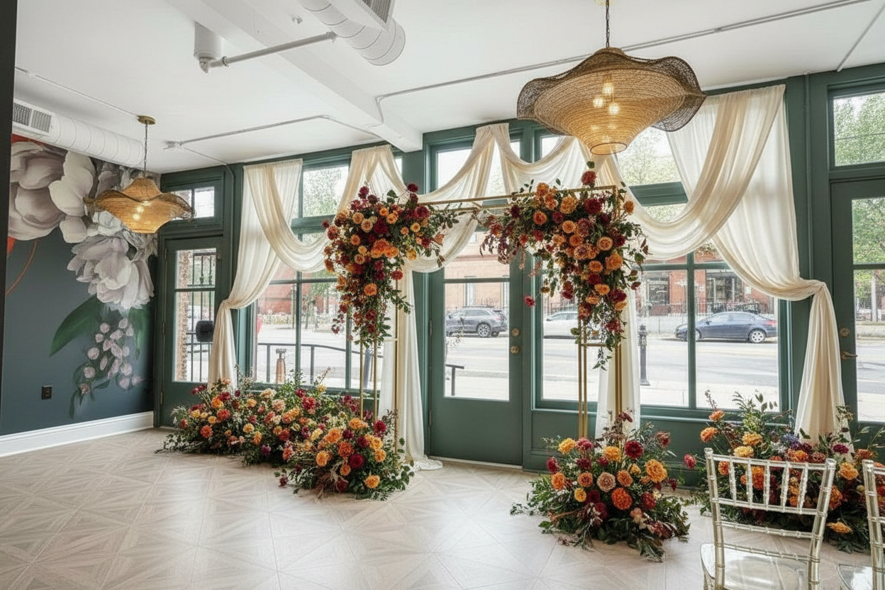 decorate this storefront for a wedding hang swooping off white linens decorate with autumnal flower arrangements and include a gold wedding arch do not change the architecture of the room