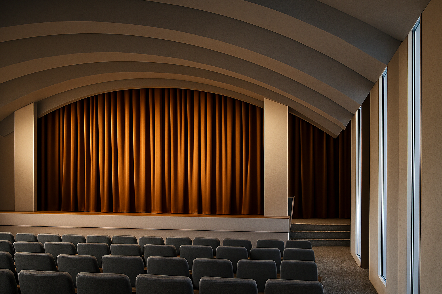 interior shot this is a view of a stage with the curtain drawn with a metal curved ceiling that is only 2 inches thick make the curved ceiling a matte metallic finish with light between the sections