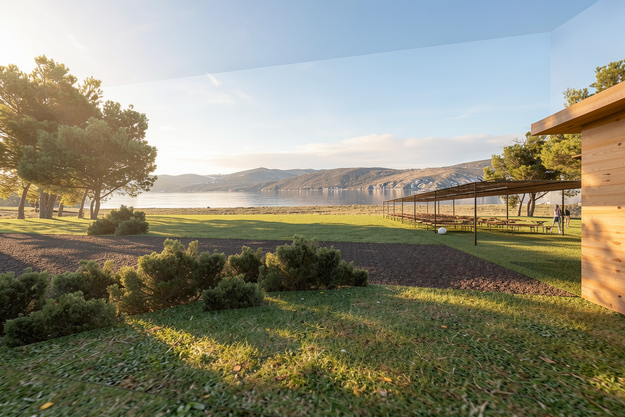 make the image with the sun setting and people entering the building remove the cars from the road
