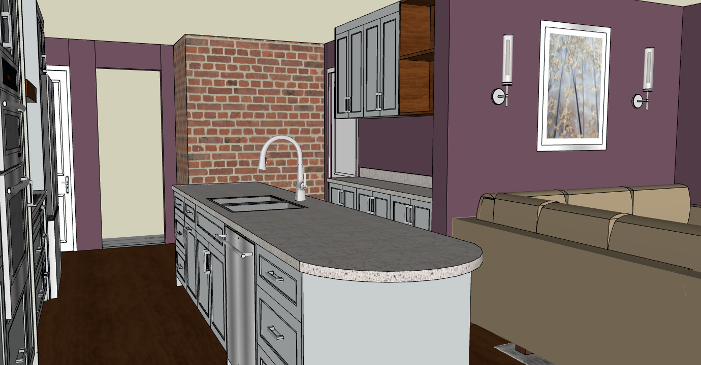 render the kitchen in perspective view the wall paint is af 630 the countertop and backsplash is lucent quartz droplets the cabinet colour is benjamin moore whitestone add led lighting under the upper cabinets