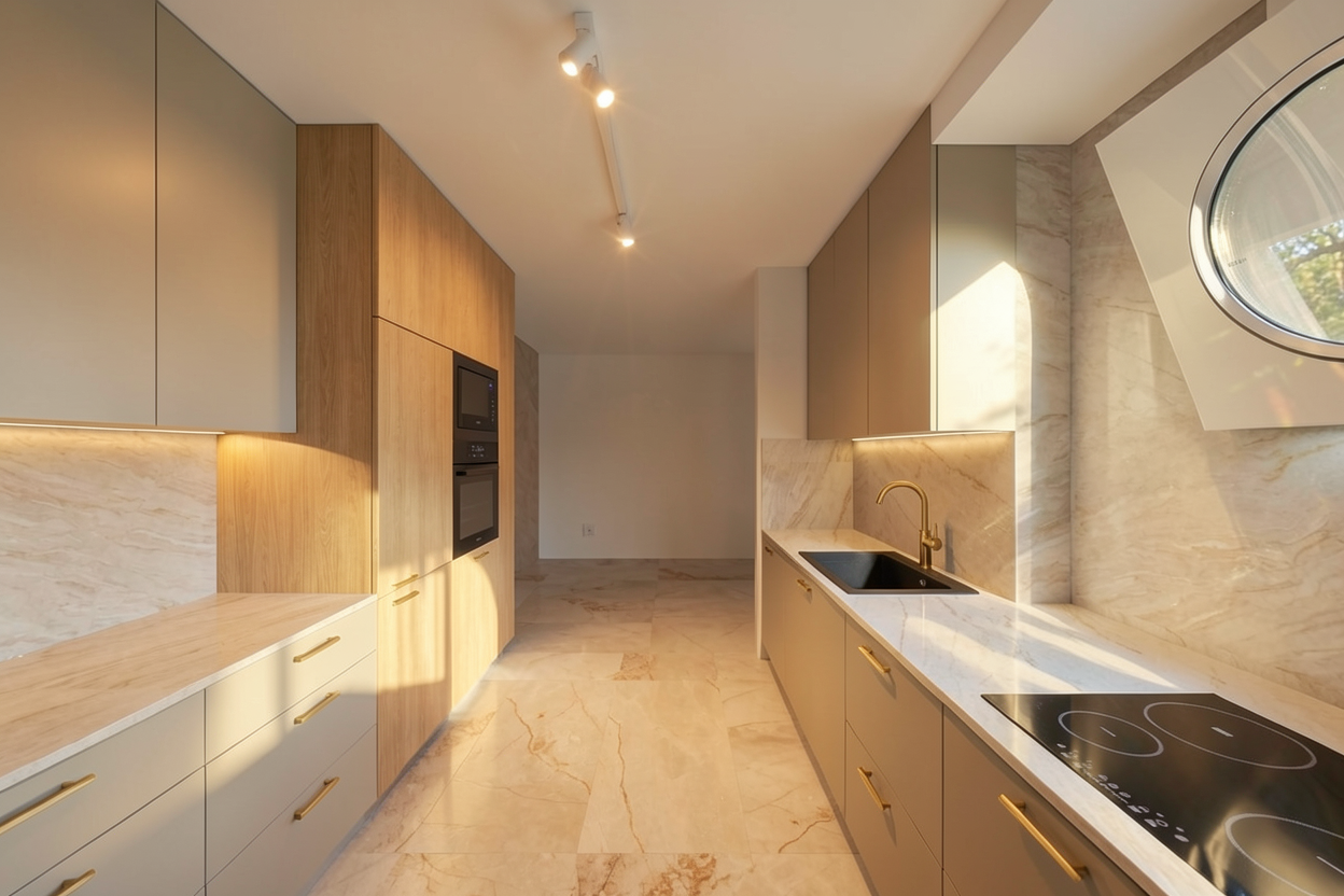 render a photorealistic interior of a marine wet research laboratory approximately 40 square metres in size roughly 7 metres wide by 6 metres deep with a modest ceiling height of around 3 metres one or two circular dark blue or black fibreglass ras recirculating aquaculture system tanks positioned in the centre of the room each approximately 1 5 metres in diameter and 1 metre deep with visible water surface gentle aeration bubbling and overhead led grow lights suspended directly above the tanks on adjustable hangers from the ceiling beside each tank a compact ras support unit drum filter or settlement cone biofilter column and water pump connected by blue and grey pvc pipework running low along the floor and walls overhead on the ceiling a busy but organised network of service pipes running the length of the room and dropping to wall mounted distribution points and tank connections seawater supply pipes in blue freshwater pipes in green compressed air lines in grey and oxygen injection lines in yellow all clearly colour coded and bracket mounted stainless steel foldable workbenches with integrated single compartment stainless sinks along the side walls with storage shelving above ocean blue forbo surestep vinyl sheet flooring with seamlessly coved washdown plinth at every wall joint fully sealed for high pressure hosing walls finished in white epoxy coated grp washdown panels no timber no soft materials inside the lab sealed white washdown rated pvc door with stainless steel push plate and lever handle no exposed wood floor drainage channel running across the centre of the room towards a stainless steel drain point exposed mid grey painted industrial ceiling with waterproof pendant lighting and visible steel structure above the room feels compact functional and purposeful a serious working marine research wet lab not a display space coastal irish research facility carna connemara render strength 90