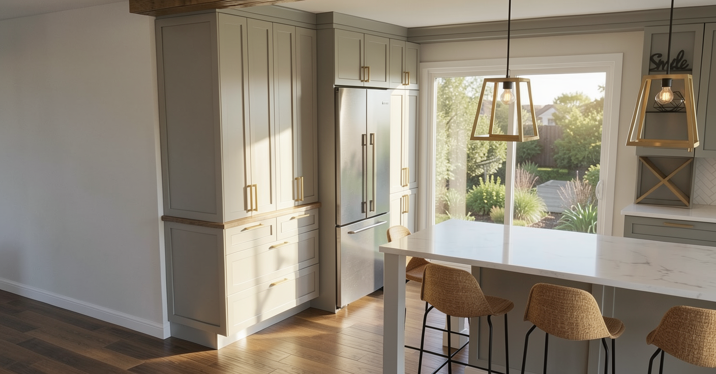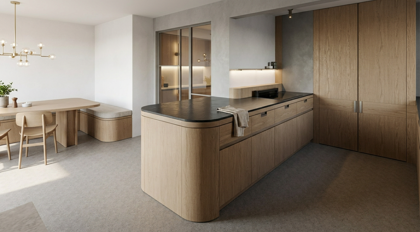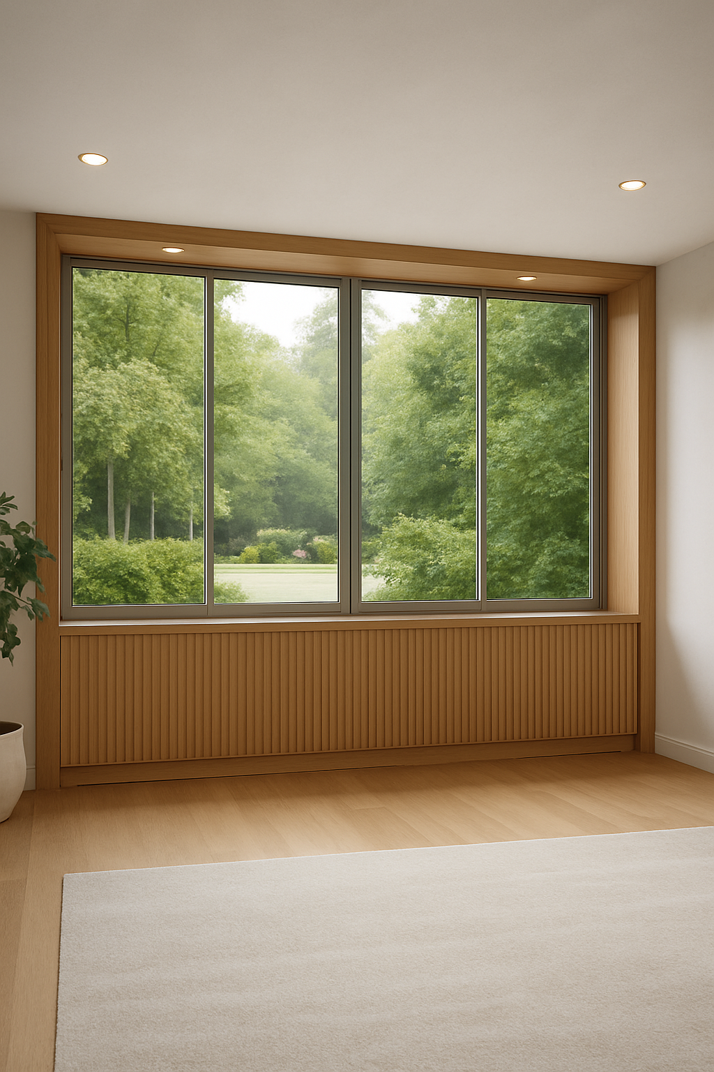 interior shot remove the indoor plant and remove the rug so only the light scandinavian oak parquet floor remains add a very slim vertical brushed aluminium mullion centered between the two middle window panels matching the existing thin silver aluminium window frames and running from the wooden cabinet top to the upper window frame outside the window show only dense green garden vegetation close to the glass with no buildings fences or structures visible keep the four large glass window panels thin aluminium frames light natural oak window surround vertical oak slatted buffet cabinet with matching wood top and soft natural daylight photorealistic scandinavian interior style